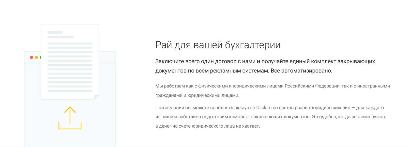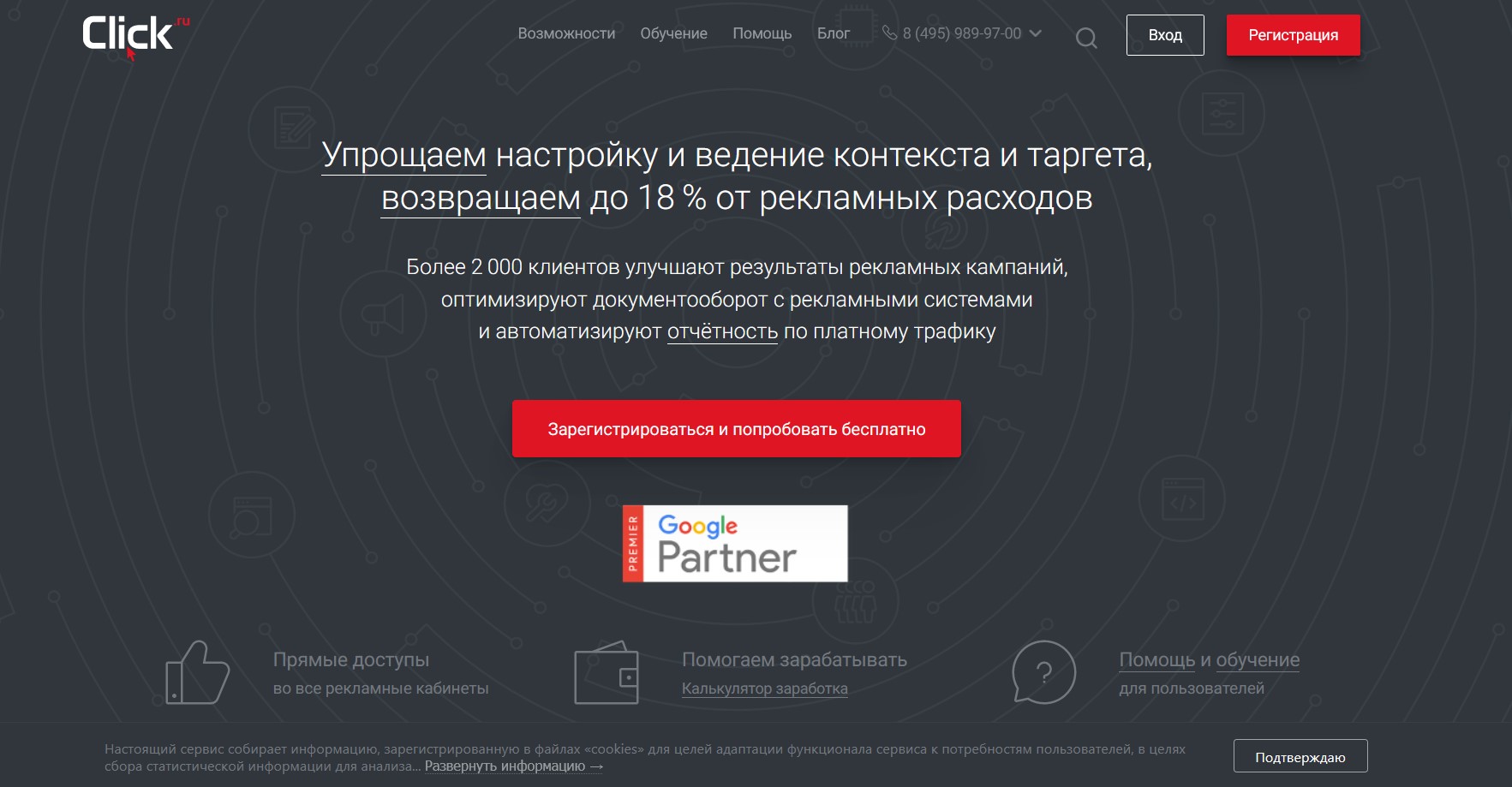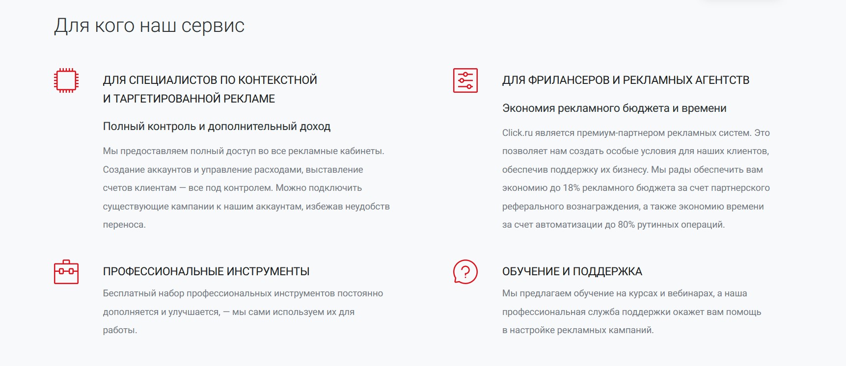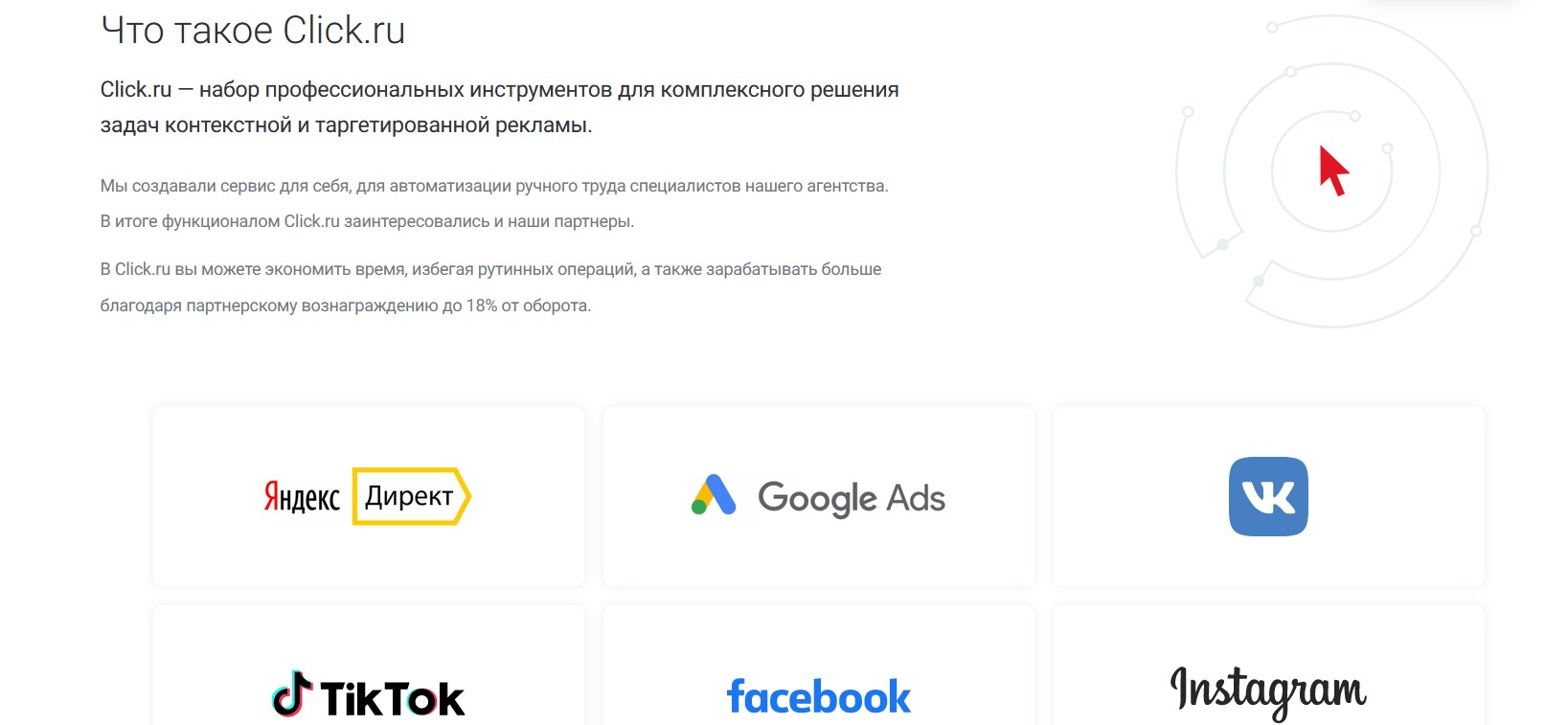 Click.ru – сервис по оптимизации таргетированной и контекстной рекламы. Располагает широким спектром инструментов по настройке рекламы, сбору информации, оптимизации и аналитике. Более 2 тысяч клиентов уже сэкономили деньги с помощью сервиса Click.ru.