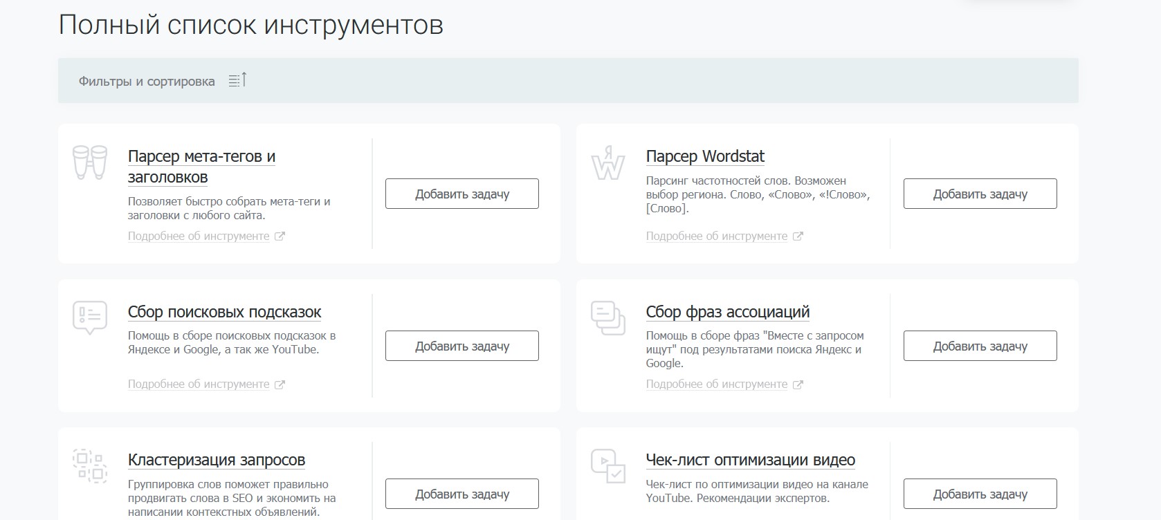 - Инструменты по сбору семантического ядра: кластеризация, парсер Вордстат и мета-тегов, обзор поисковых подсказок.