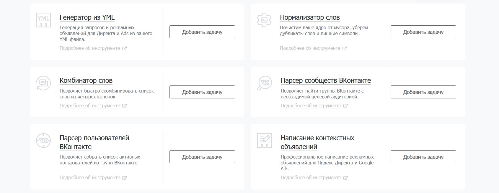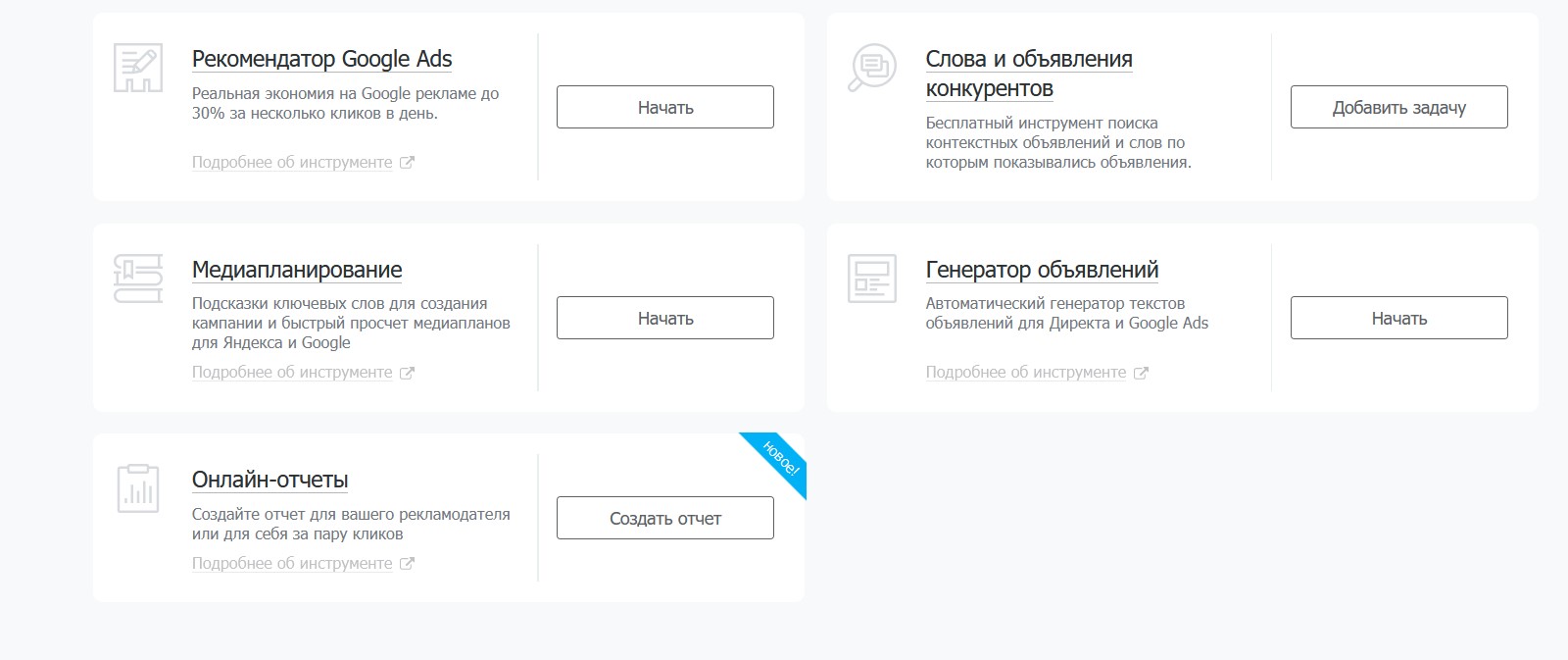 - Инструменты по работе с контекстной рекламой: написание объявлений, поиск объявлений конкурентов, генерация.