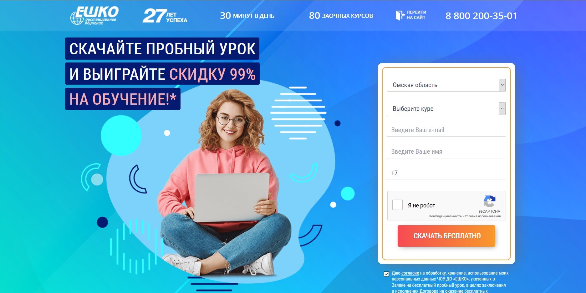 Центр дистанционного обучения Ешко давно известен на российском рынке, работает с 1993 года. У каждого студента есть личный преподаватель, все учебные материалы находятся в личном кабинете. Обучение основано на комбинации онлайн формата и рассылке комплекта учебных материалов с отправкой домашних заданий. Со студентами заключается договор отдельно на каждый курс. По итогам прохождения курса проводится аттестация.