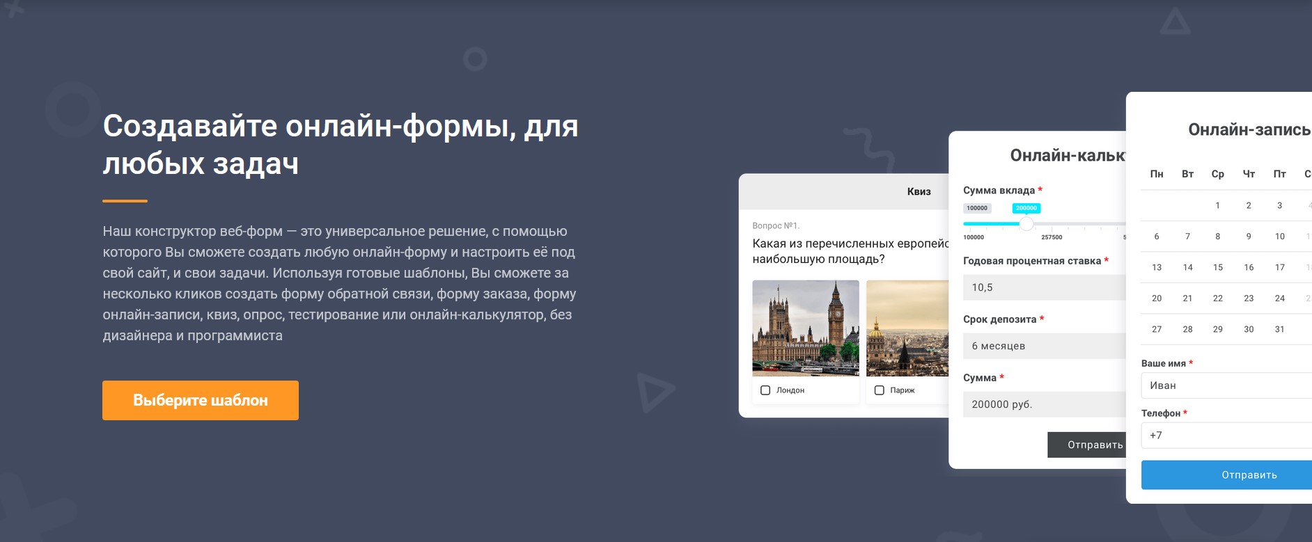 FormDesigner – универсальное решение, с помощью которого можно создать любую онлайн-форму и настроить ее под свой сайт и свои задачи. Используя готовые шаблоны, можно создать форму обратной связи, форму заказа, онлайн-форму записи, викторину, опрос, тестирование или онлайн-калькулятор в несколько кликов, без дизайнера или программиста.