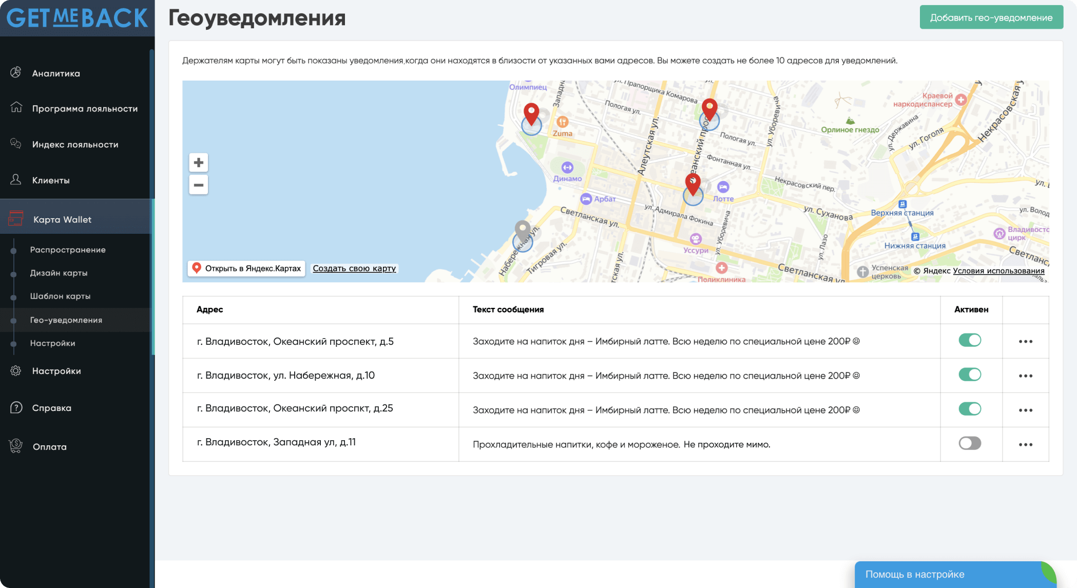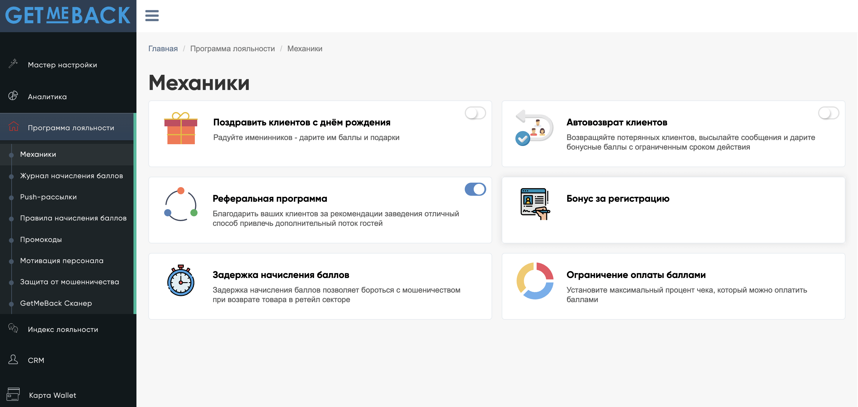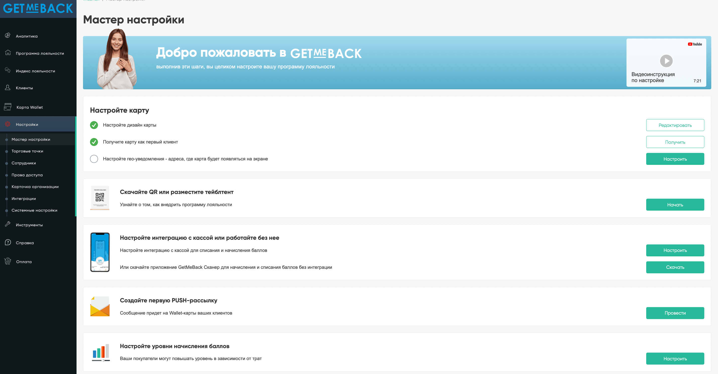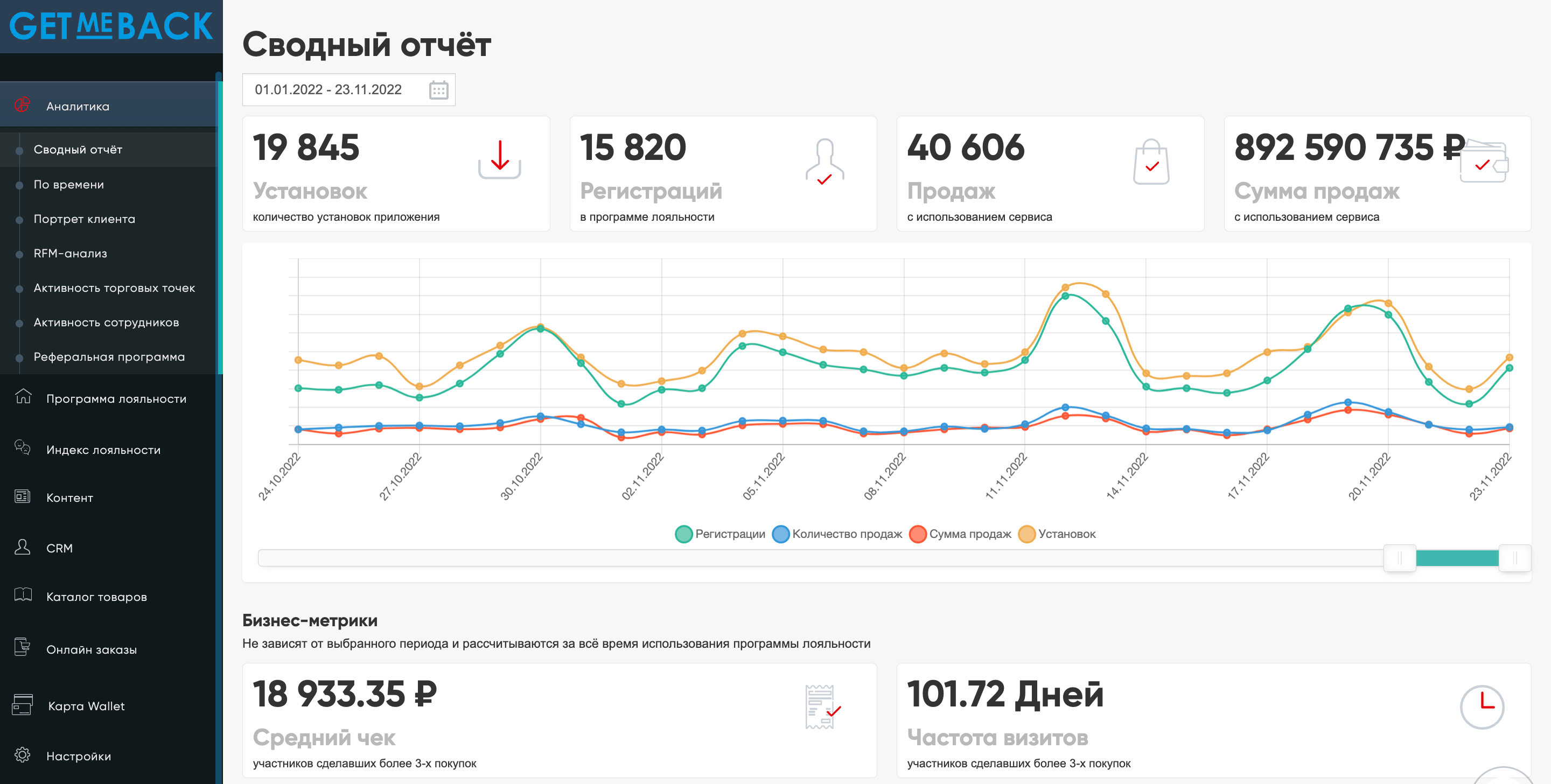 GetMeBack – cервиc, который закрывает потребность бизнеса в создании собственной программы лояльности. Сервис помогает удержать действующих клиентов, привлечь новых покупателей, повысить средний чек и повторные продажи, минимизировать отток клиентов.