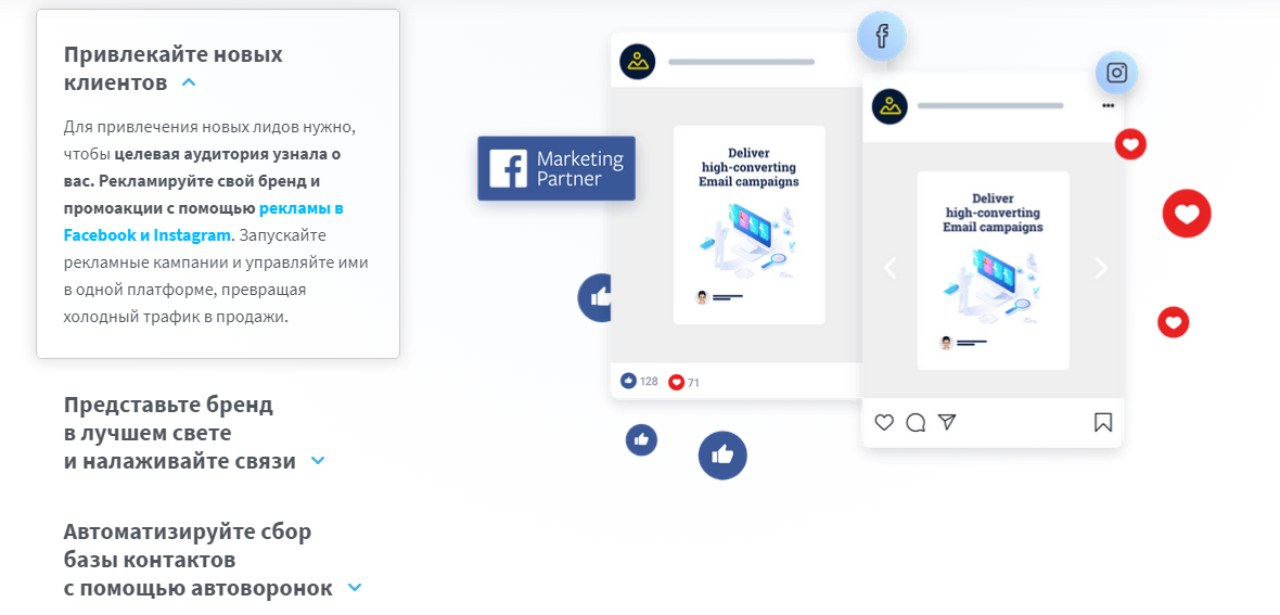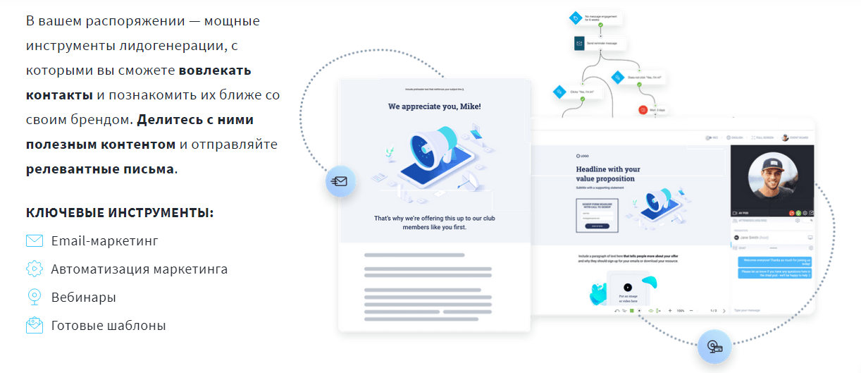 GetResponse – мощный и универсальный инструмент для отправки электронных писем, создания целевых страниц и автоматизации маркетинга. С помощью эффективных инструментов лидогенерации можно привлечь больше клиентов. Сервис имеет встроенные редакторы, интеграцию с другими программами.