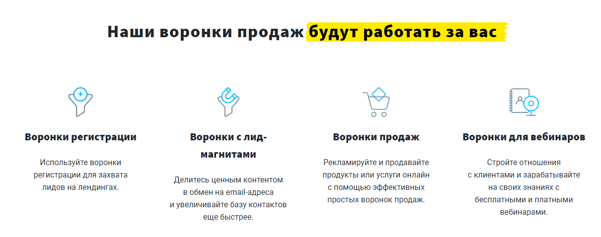 GetResponse поможет создать лендинг, настроить чат, отправлять клиентам целевые рассылки, продавать в социальных сетях. Редакторы и автоворонки помогут сделать процесс быстрым и эффективным. Инструменты аналитики покажут эффективность произведенных действий.
