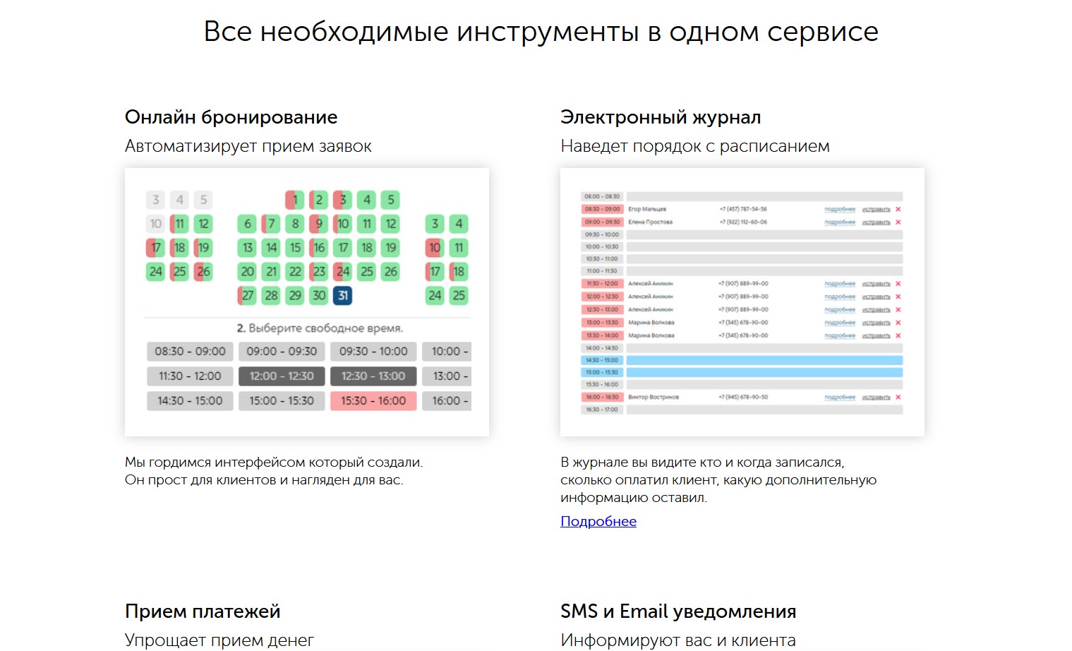- Электронный журнал с полным содержанием истории записей, дополнительной информации о клиенте и оплат.