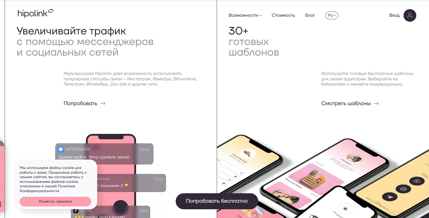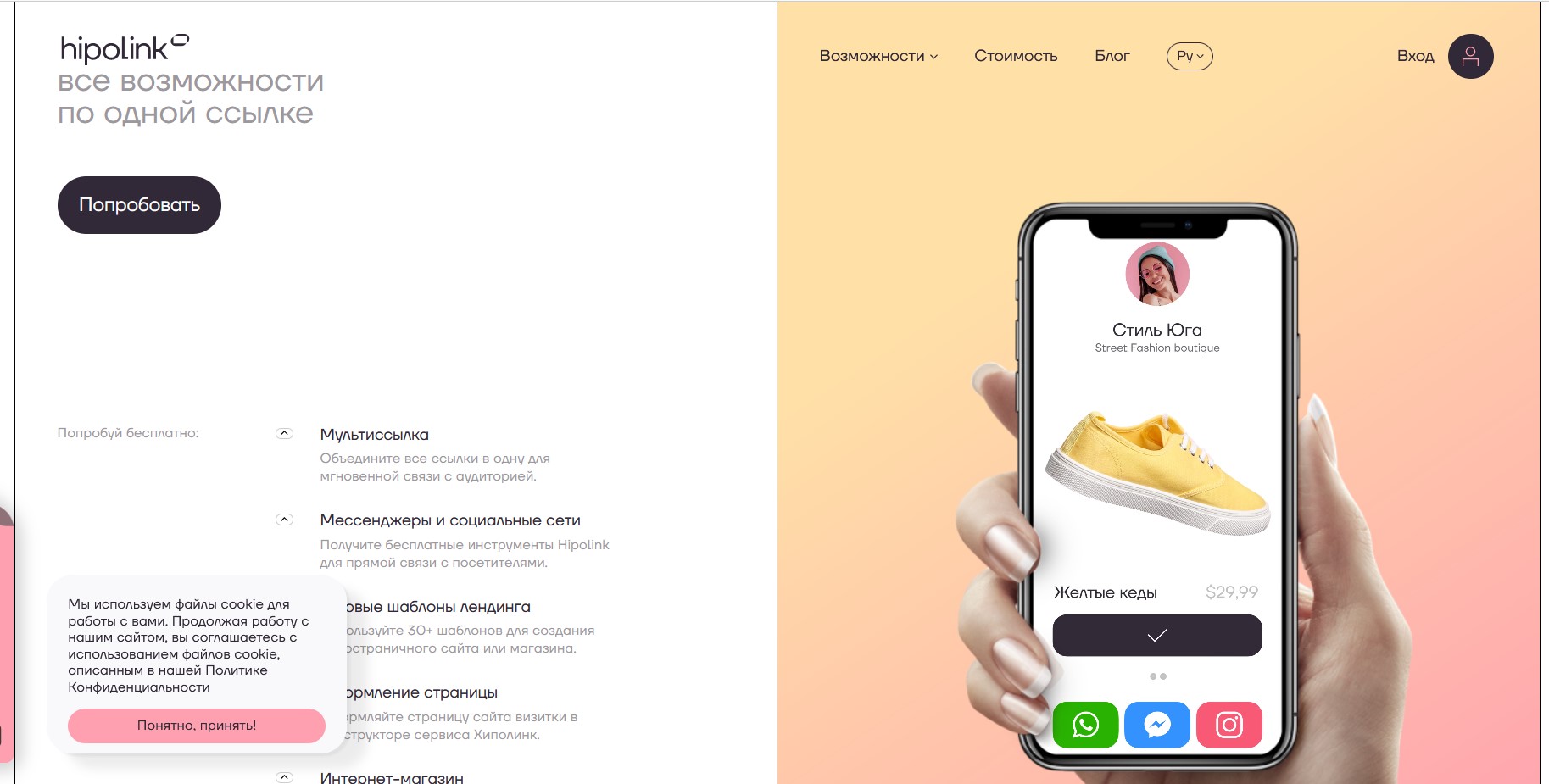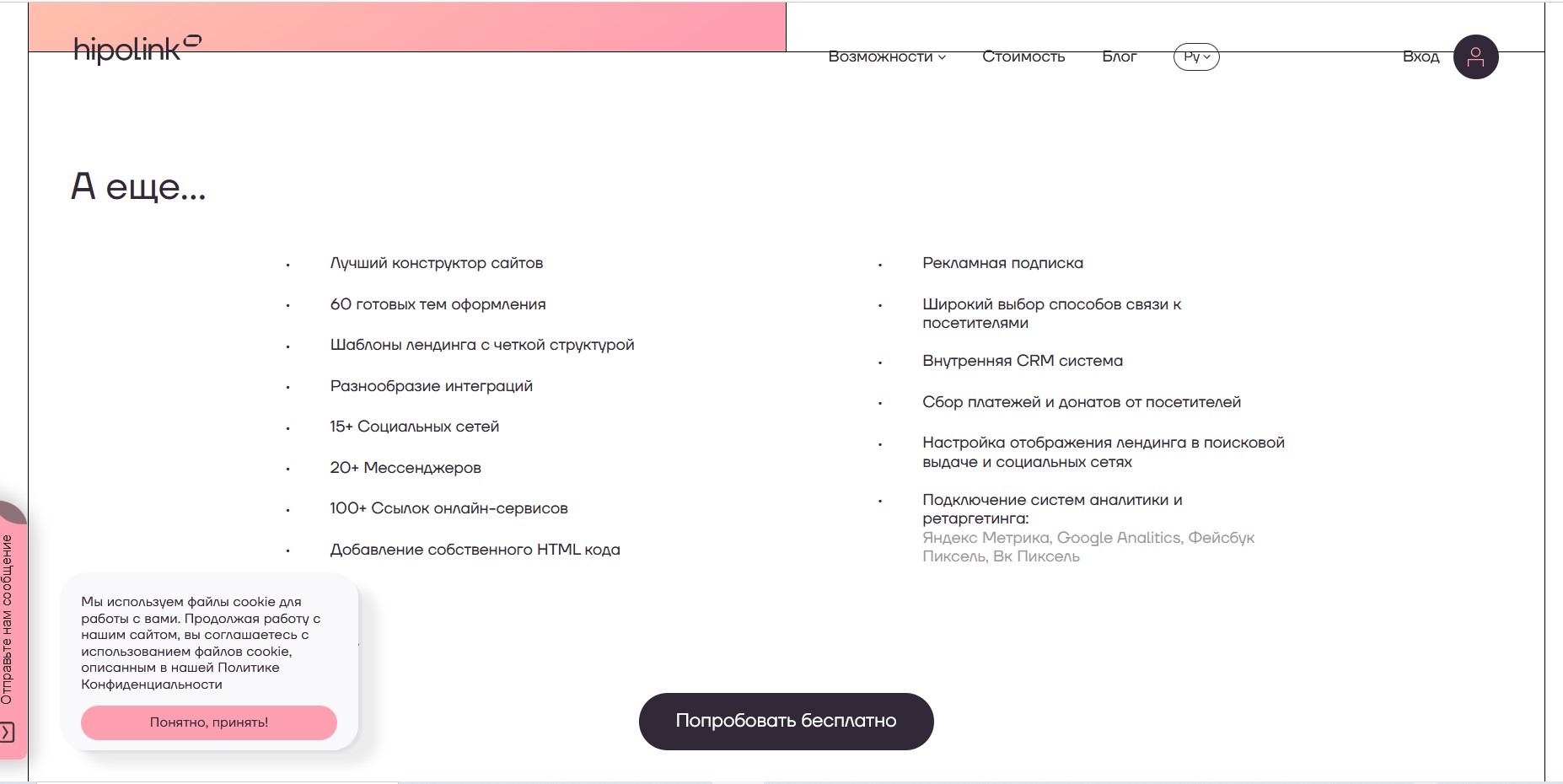 Hipolink – простой конструктор лендинга и магазина с широким спектром дополнительных интеграций с социальными сетями, мессенджерами и онлайн- сервисами. Встроенная CRM и аналитика позволять видеть полную картину о посетителях и продажах.