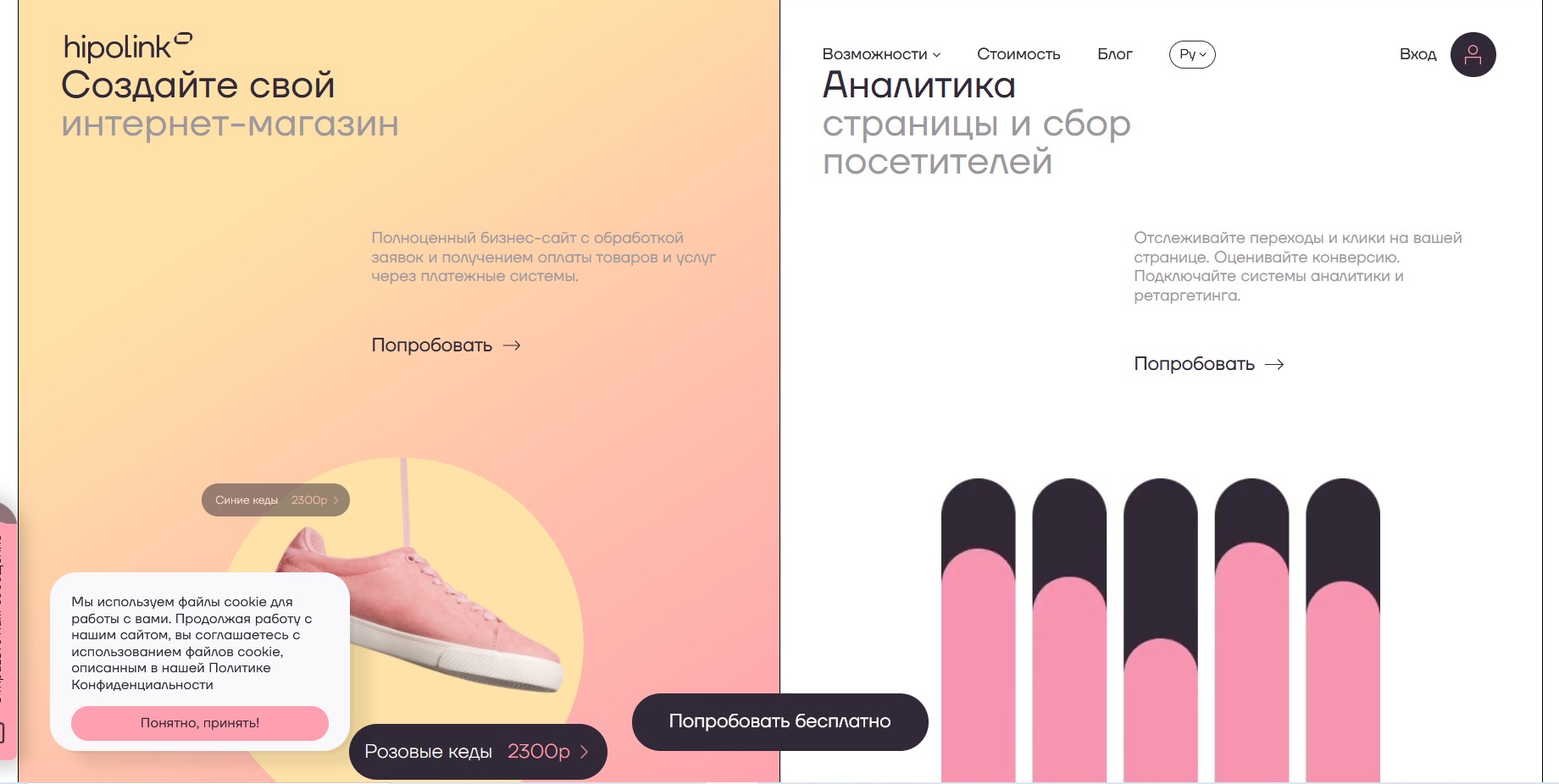 Hipolink поможет создать свой интернет магазин или целевую страницу для продажи товаров и услуг. Разнообразие шаблонов и настроек позволит собрать сайт и опубликовать его в поисковой системе.