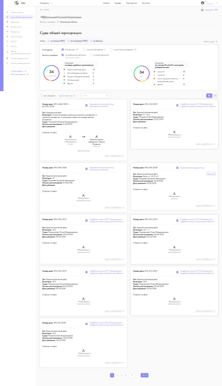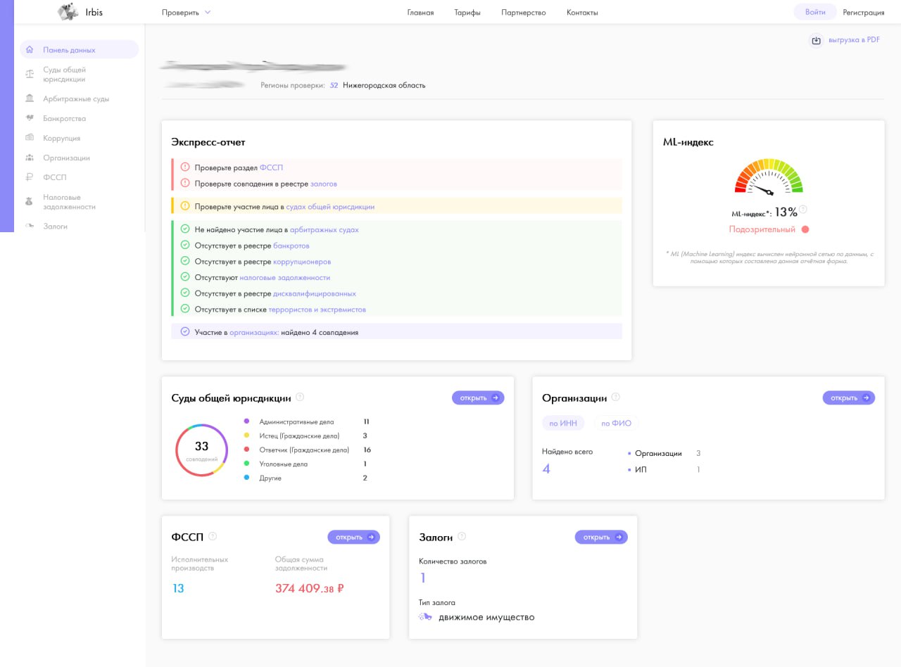«Ирбис» — это проверка правовой надежности людей и компаний по всей России, не противоречит 152-ФЗ. Доступны 656 млн дел судов общей юрисдикции и другие источники в автоматическом отчете с предварительным индексом благонадежности.