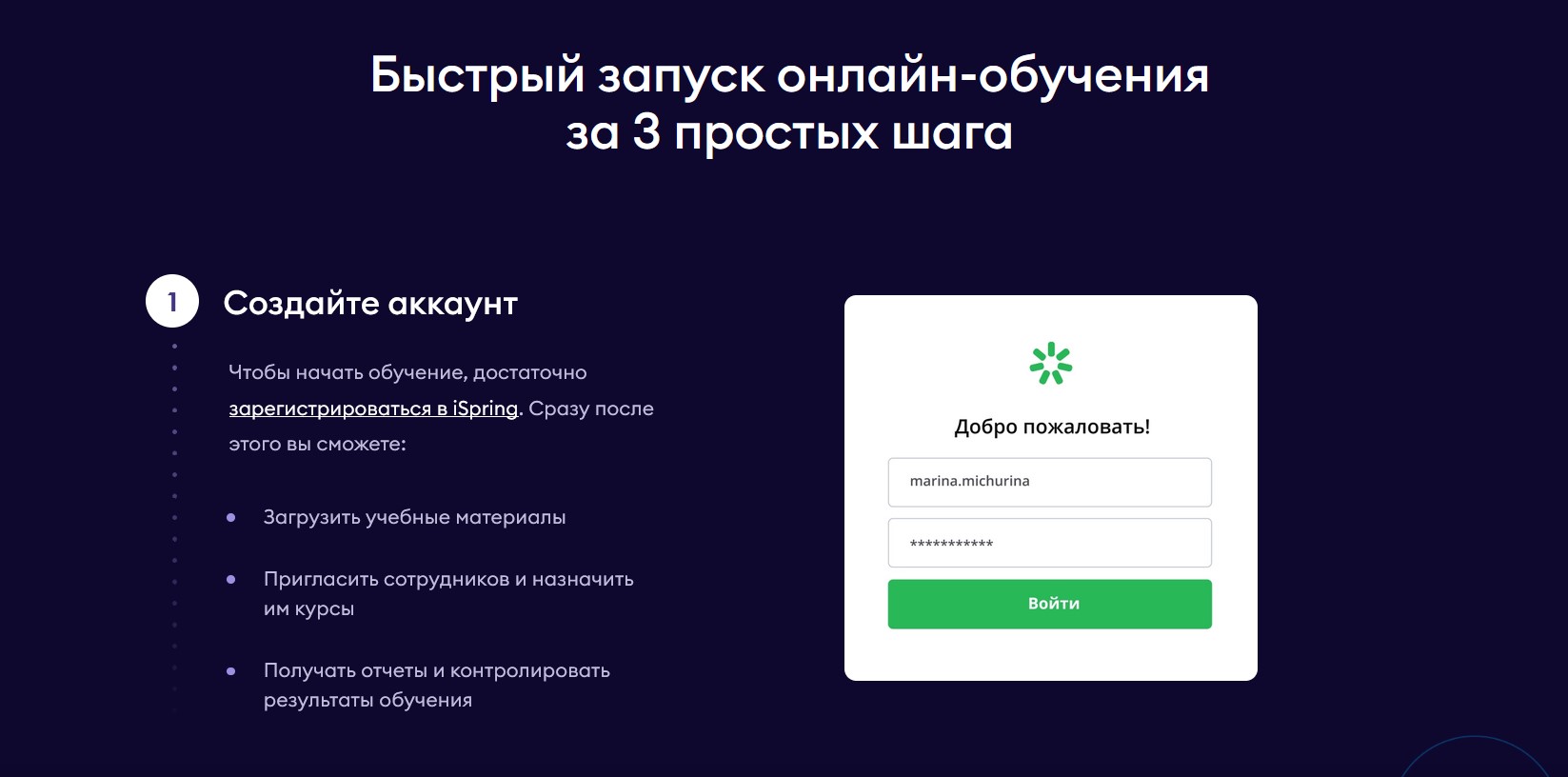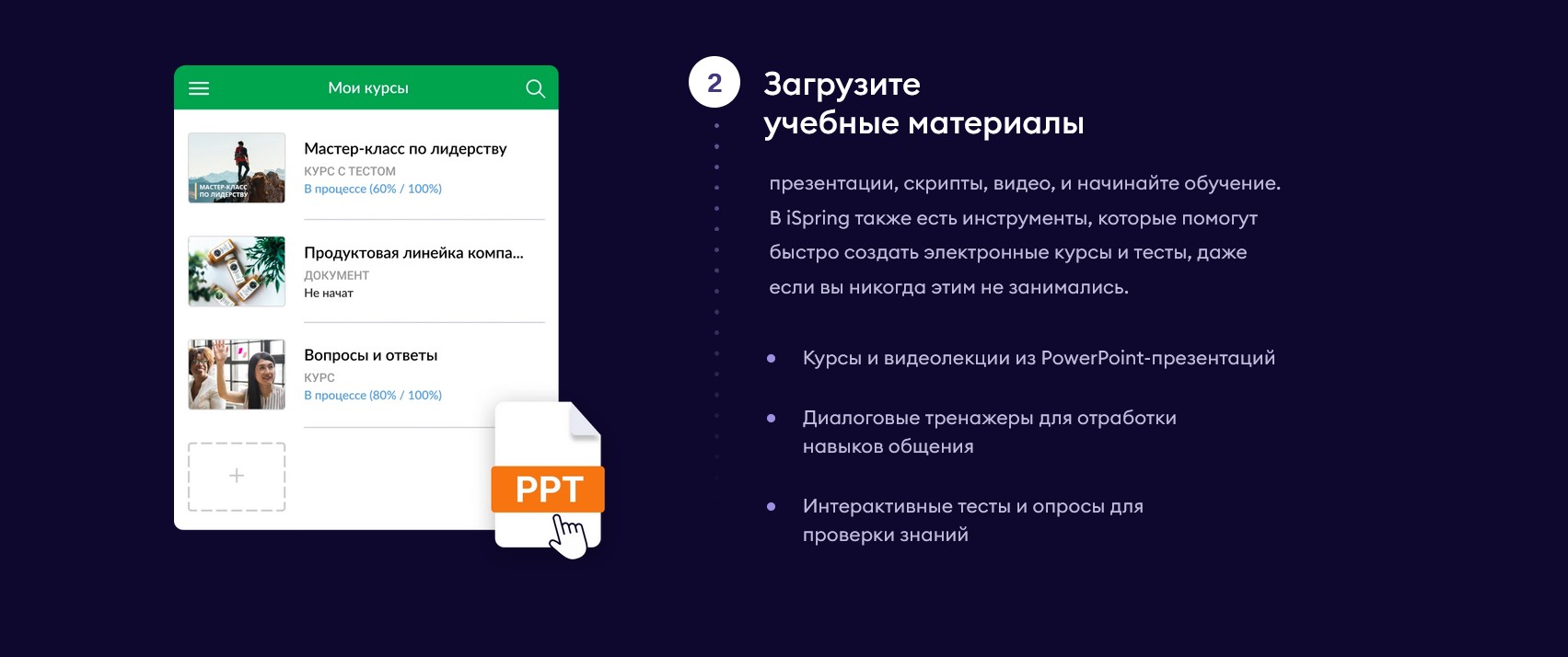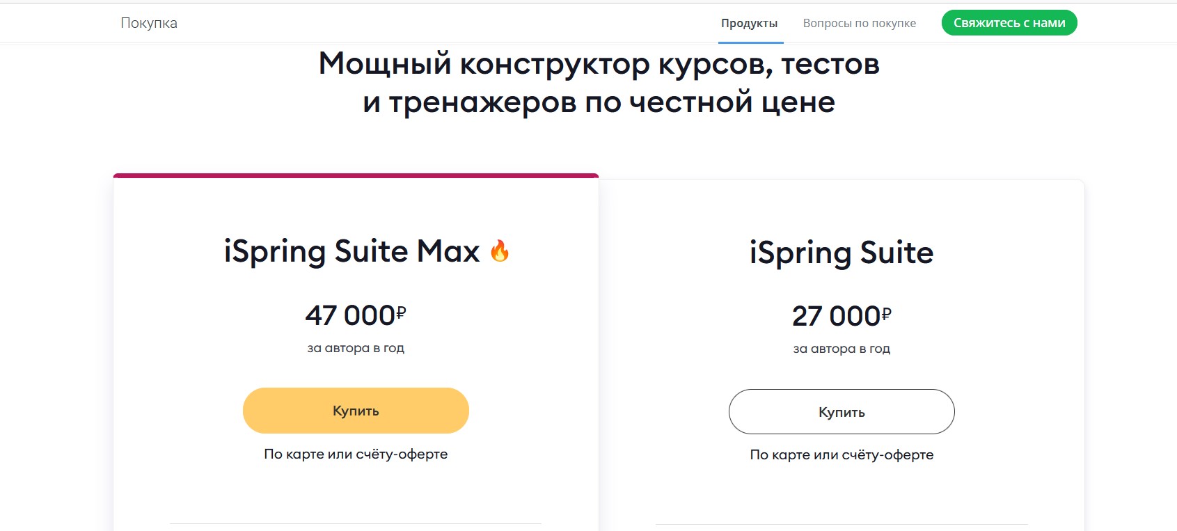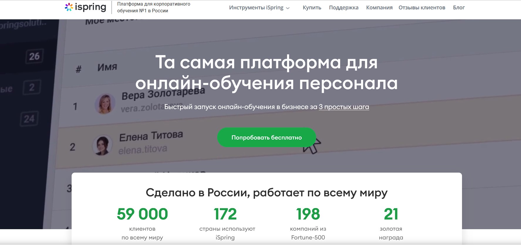 iSpring – комплексный сервис и надежный инструментарий для создания курсов электронного обучения с викторинами, интерактивными оценками, симуляциями диалогов, видео-тренингами и скринкастами. Онлайн – школа или предприятие может создать свой курс и тесты проверки знаний в одном сервисе.