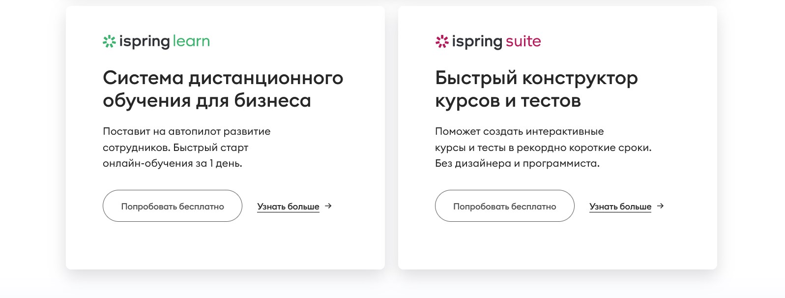 В комплекс входит пять продуктов: iSpring Learn – онлайн обучение и тестирование для сотрудников, iSpring Presenter – создание курса из презентаций, iSpring Page – микрокурсы (например для входящего обучения линейного персонала), iSpring Suite – тесты и проверка знаний, iSpring Market – витрина продаж курсов.