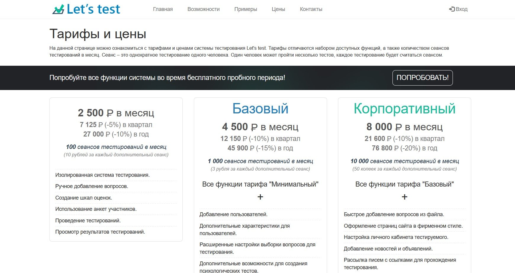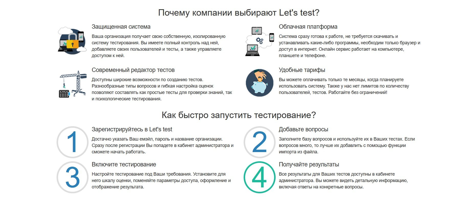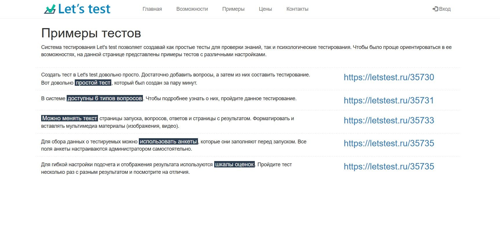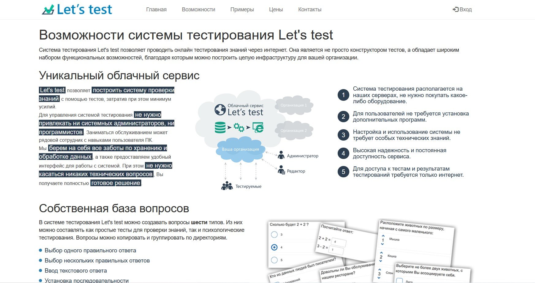 Let’s test – онлайн сервис проверки знаний сотрудников и удобный конструктор тестов. Сервис полезен для бизнеса, который проводит аттестацию сотрудников, образовательным учреждениям и кадровым агентствам для проведения психологического или квалификационного тестирования.