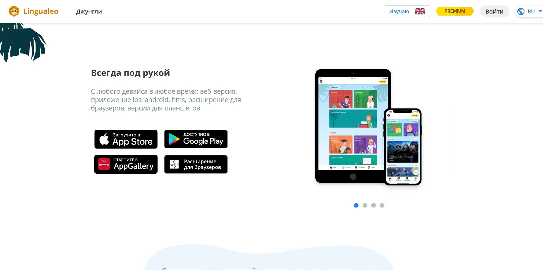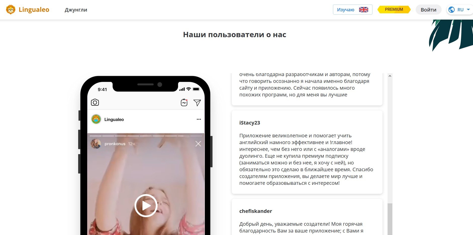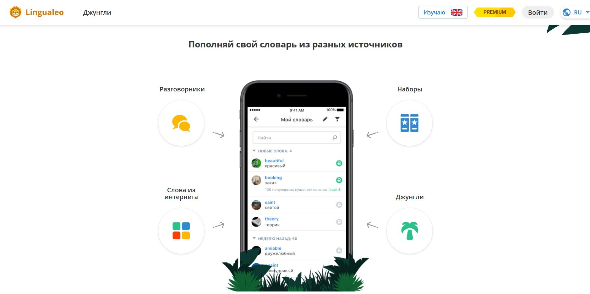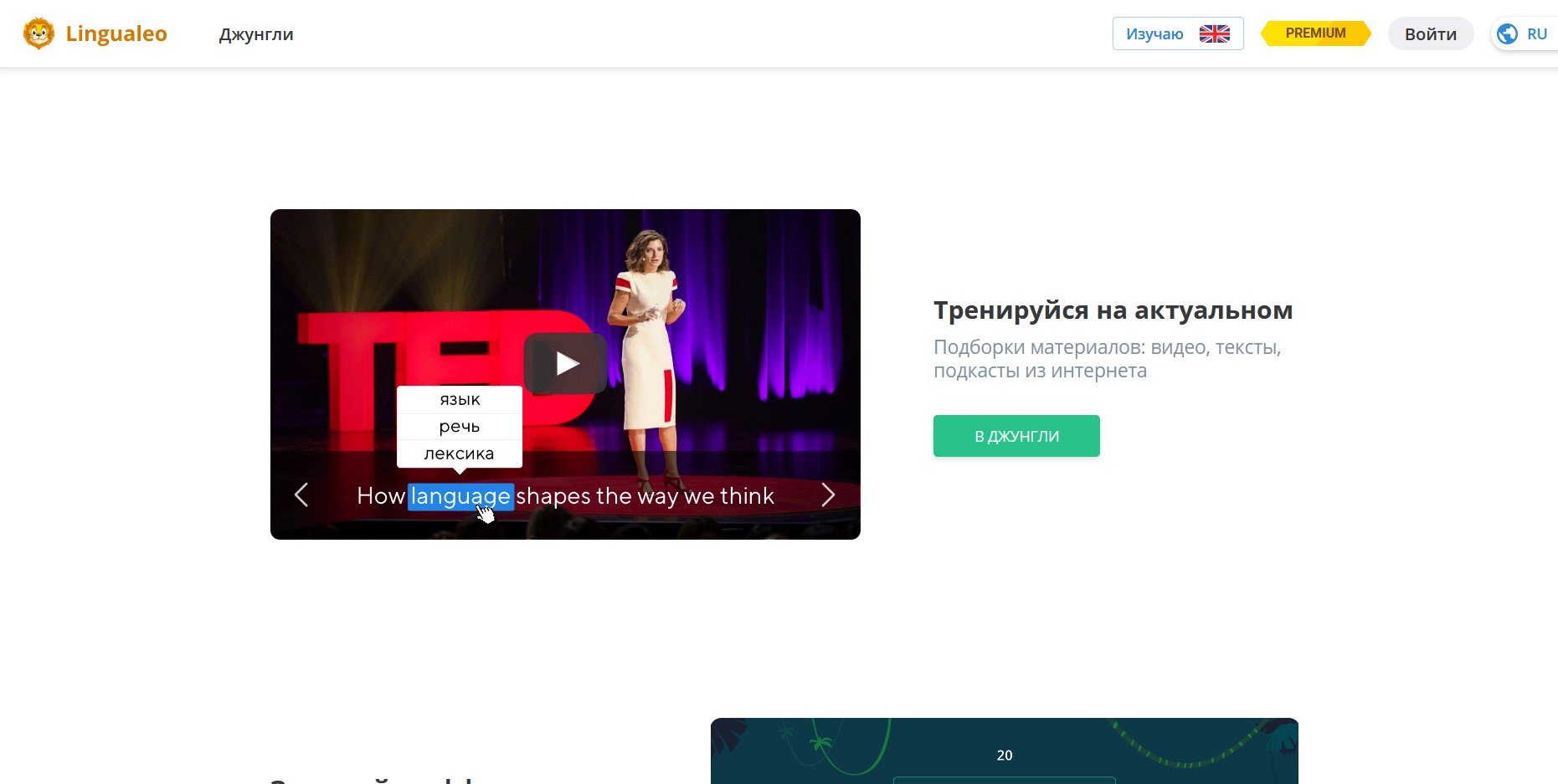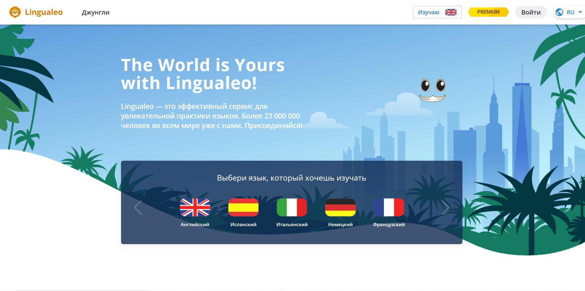 LinguaLeo – онлайн школа обучения английскому, испанскому, немецкому, французскому и многим другим европейским и азиатским языкам. В онлайн школе обучается более 23 млн. человек по всему миру. В процессе обучения активно используется игровая механика, которая доказала свою эффективность для всех возрастов. На сайте школы есть специальный раздел «Джунгли», который содержит видео, музыку, книги и фильмы на разных языках. Зарегистрированные пользователи могут пополнять раздел своим контентом.