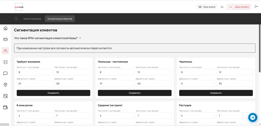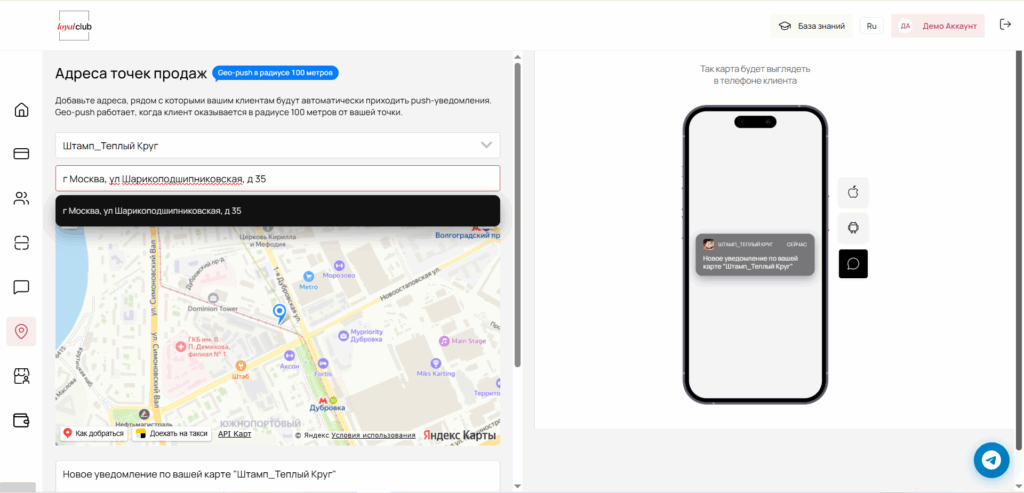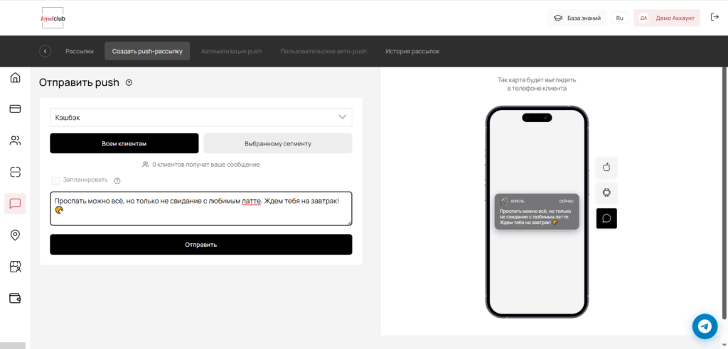 • Коммуникации: безлимитные push-уведомления и geo-push (когда клиент рядом), сценарии и триггеры