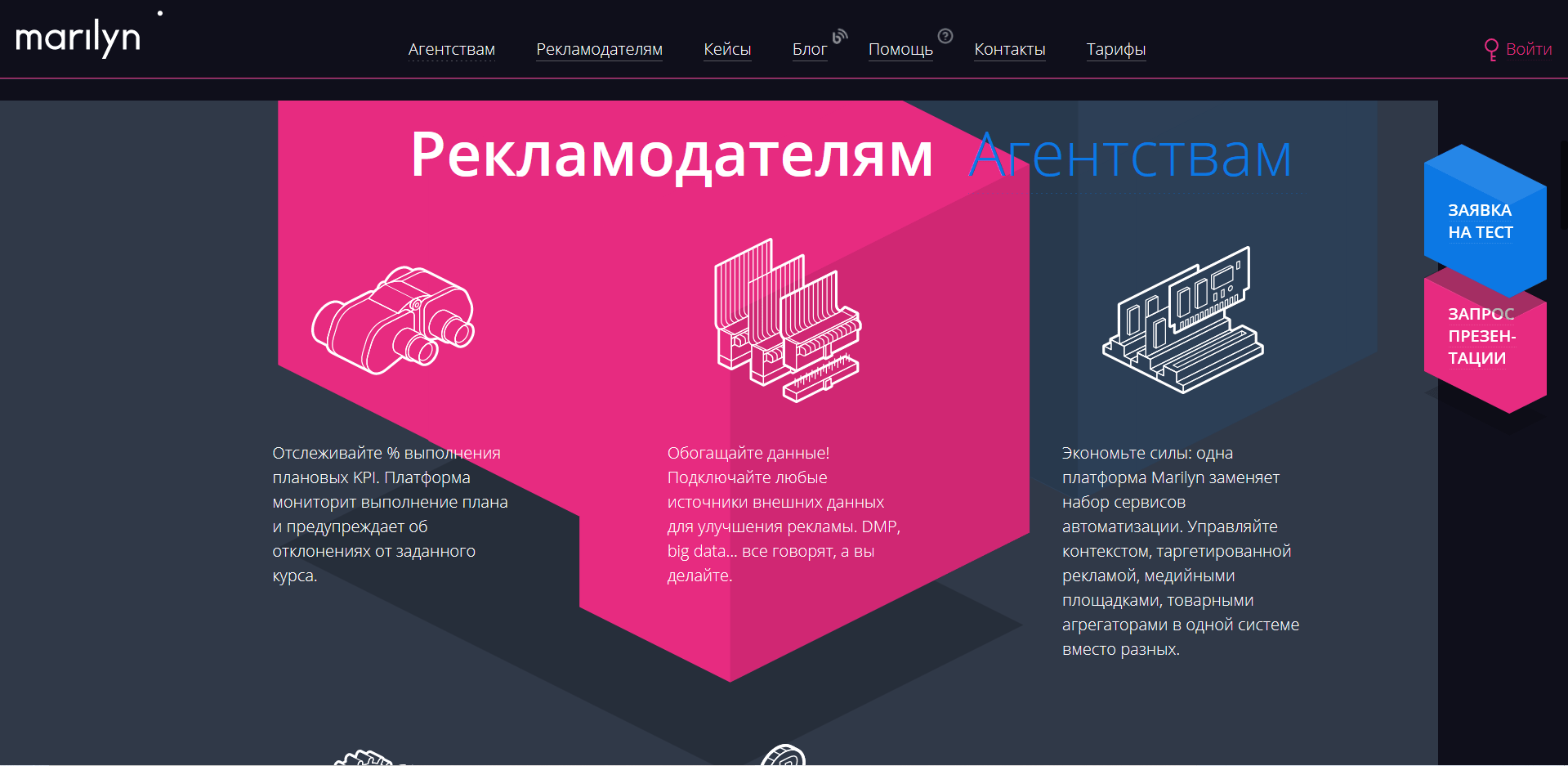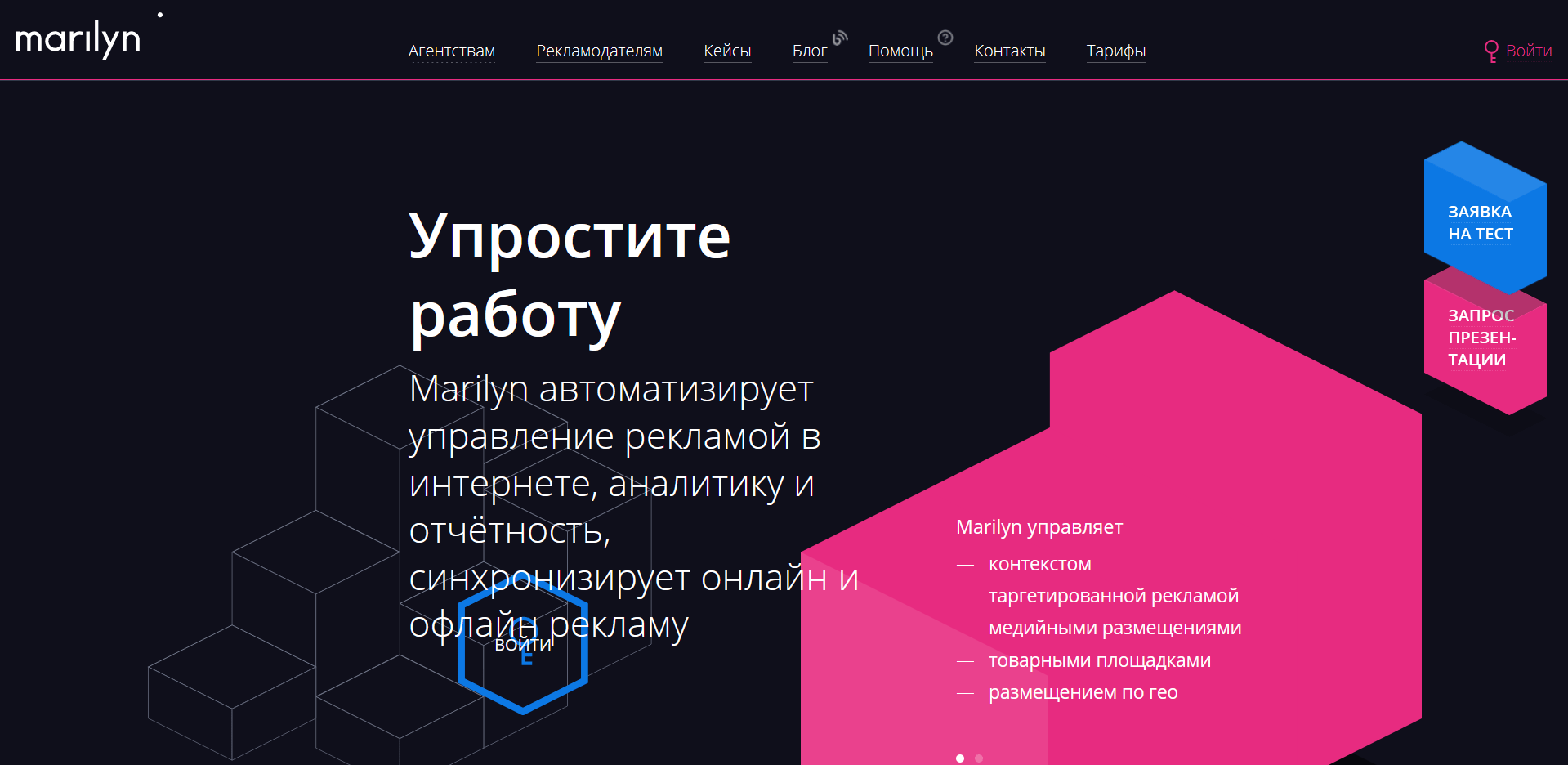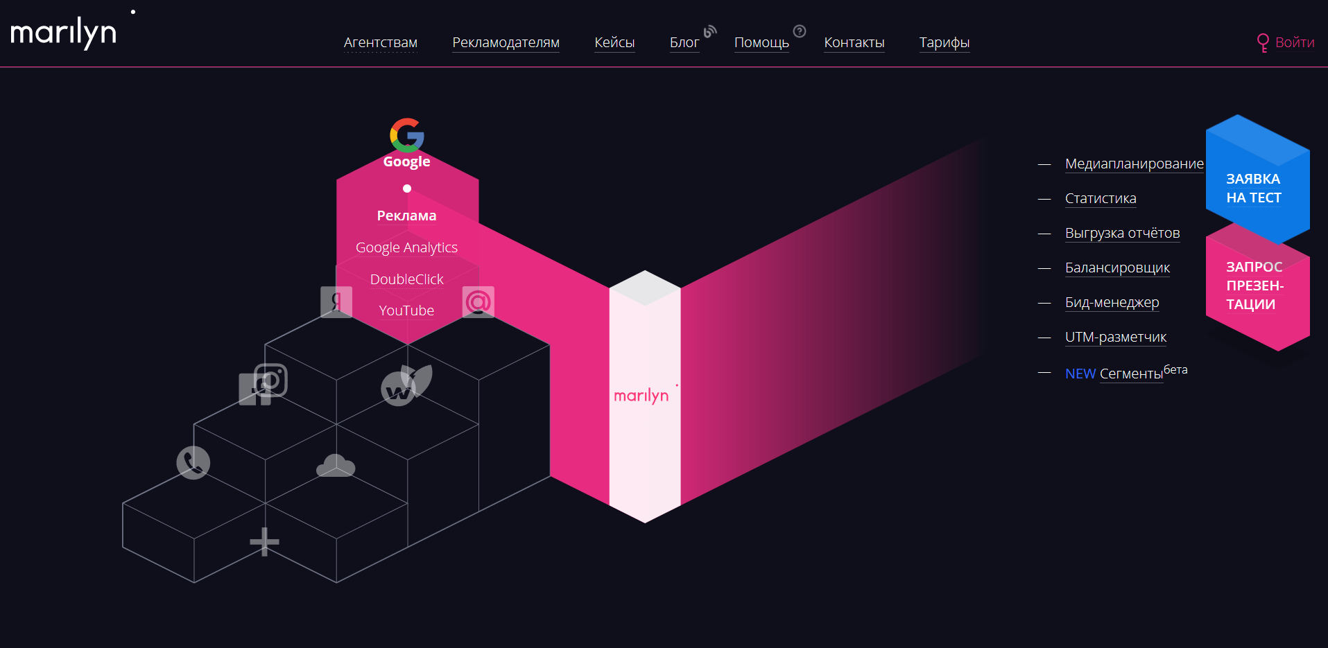 Marilyn – онлайн платформа автоматизации маркетинга, созданная для самостоятельной работы рекламодателя и управления своими рекламными кампаниями. Платформа имеет понятные настройки, широкие возможности использования видов рекламы и площадок, и позволяет отслеживать показатели достижения целей.