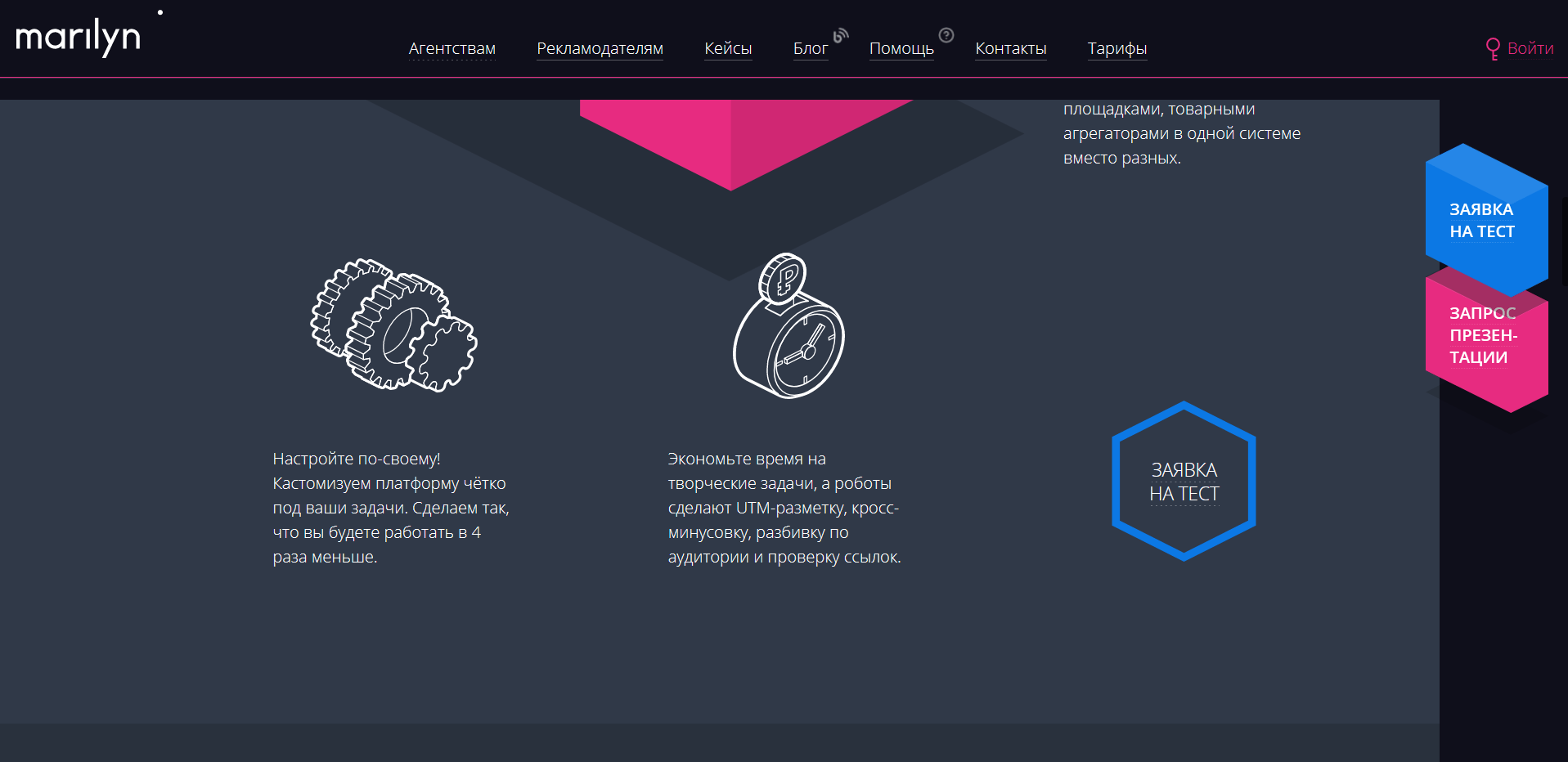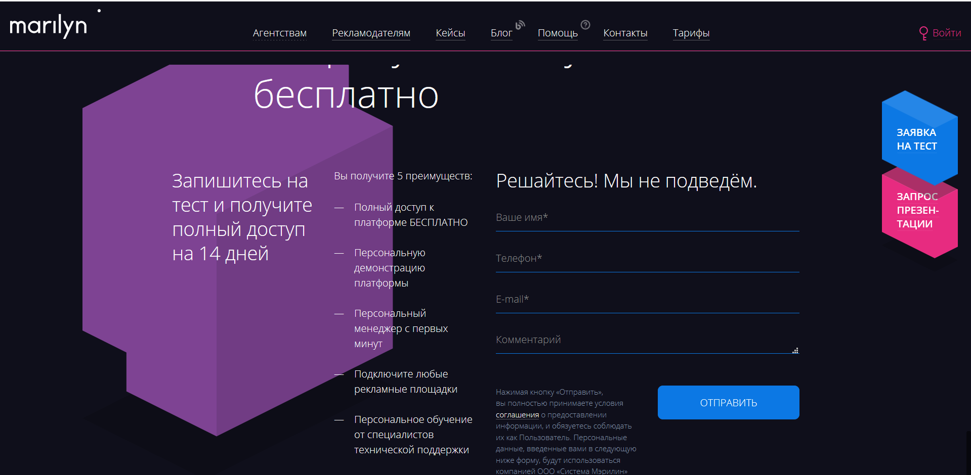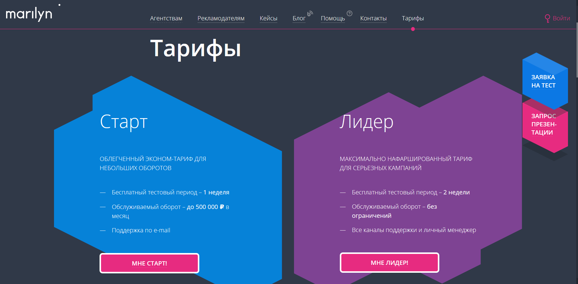 Marilyn – онлайн платформа автоматизации маркетинга, созданная для самостоятельной работы рекламодателя и управления своими рекламными кампаниями. Платформа имеет понятные настройки, широкие возможности использования видов рекламы и площадок, и позволяет отслеживать показатели достижения целей.