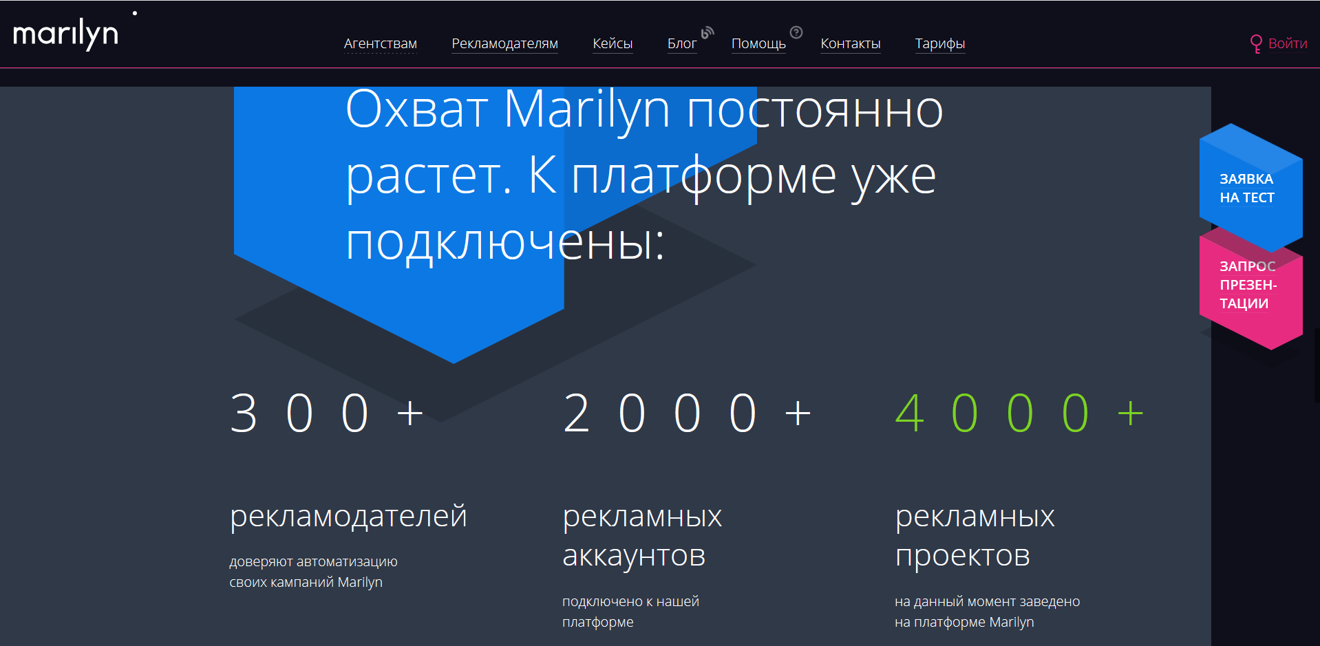 Сервис Marilyn создан для автоматизации рекламных кампаний. Им можно пользоваться через агентство или самостоятельно. Позволяет проводить масштабную рекламу одновременно на нескольких площадках. Автоматизированная отчетность в ежедневном режиме позволяет быть в курсе расходования бюджета и достижения целей.
