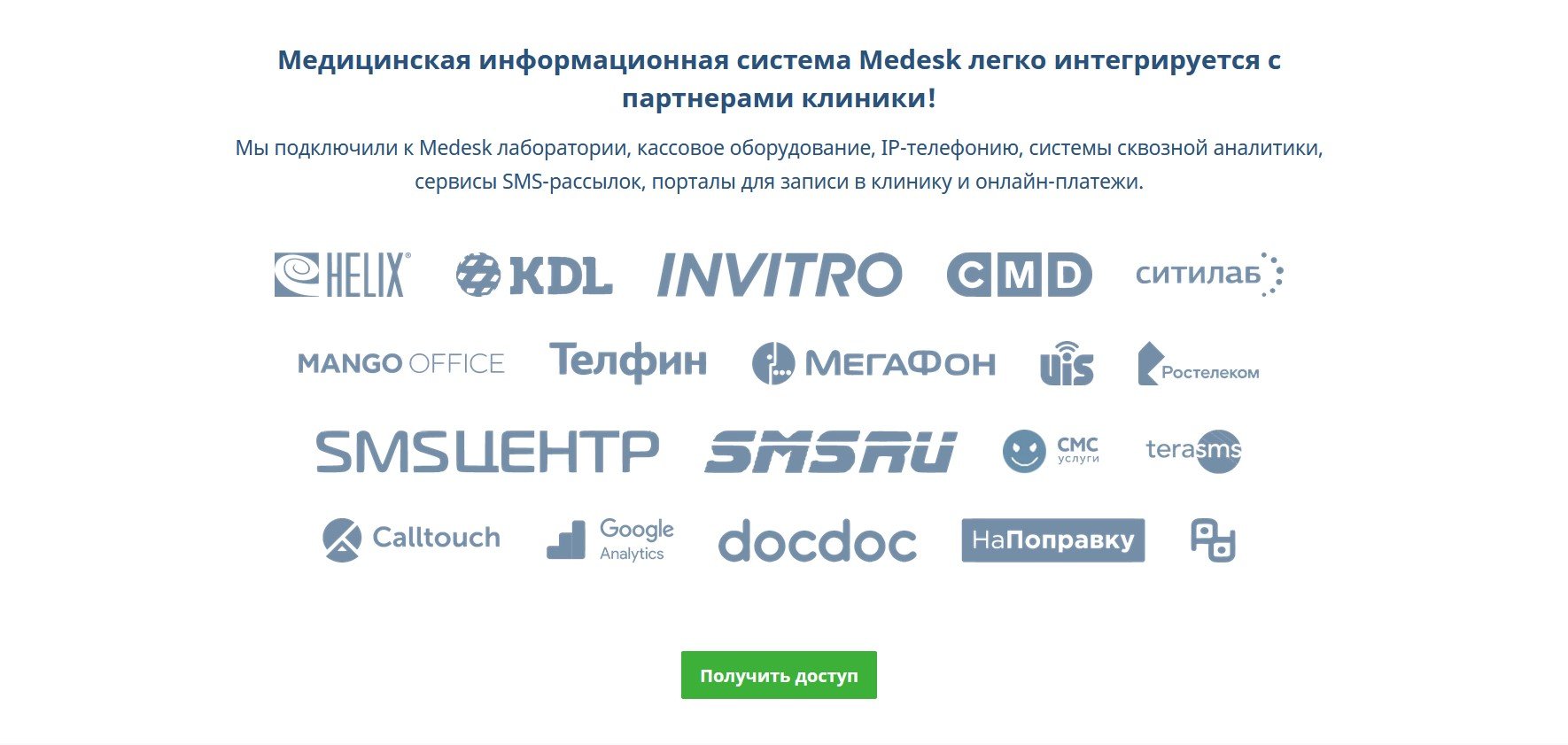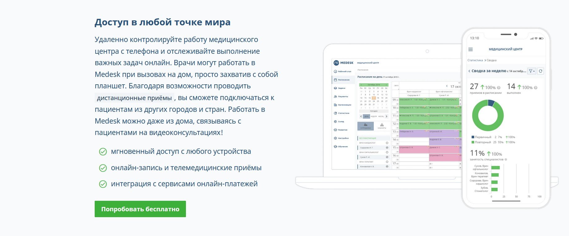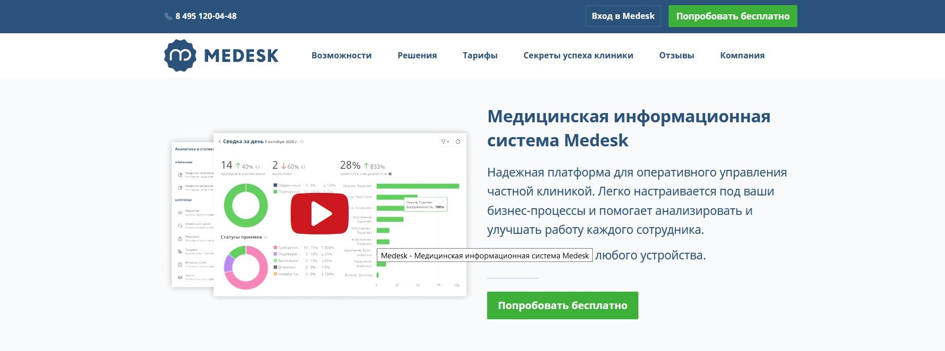 Medesk – это программное обеспечение, предназначенное для частных клиник и больниц. Создано специалистами-медиками. Сервис снижает рабочую нагрузку и упрощает работу с пациентами.