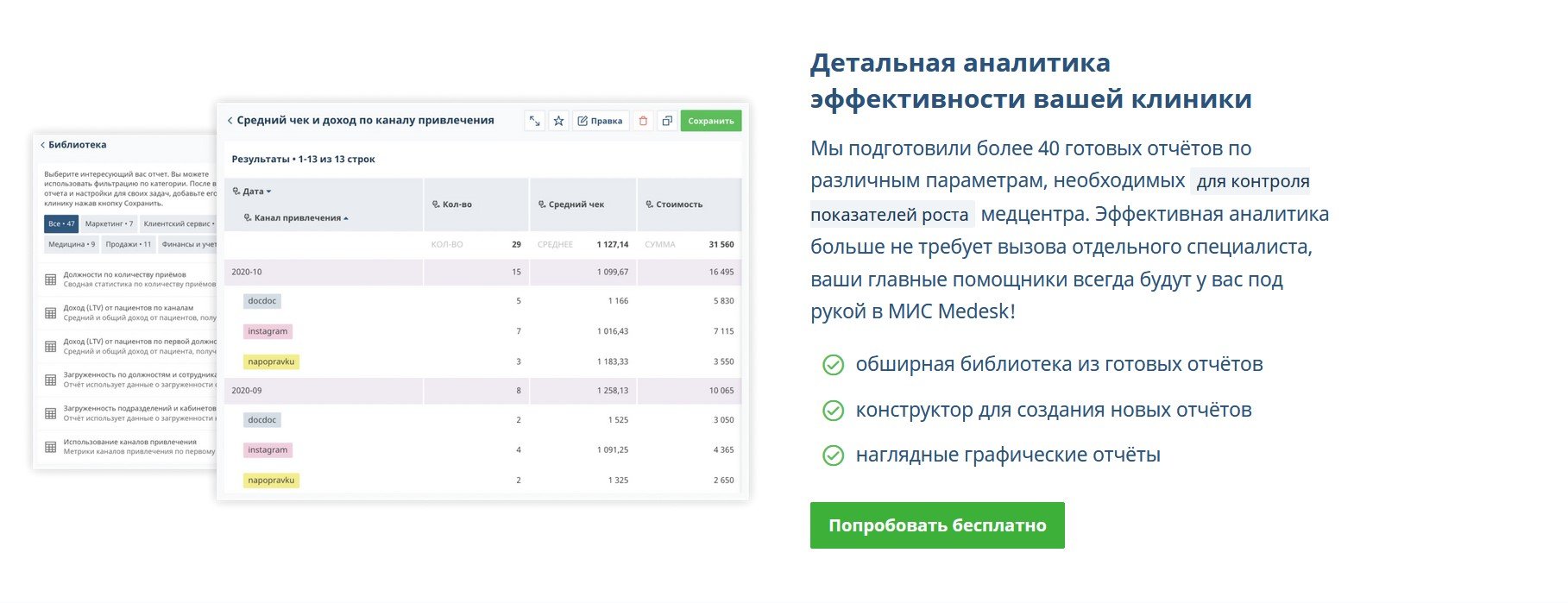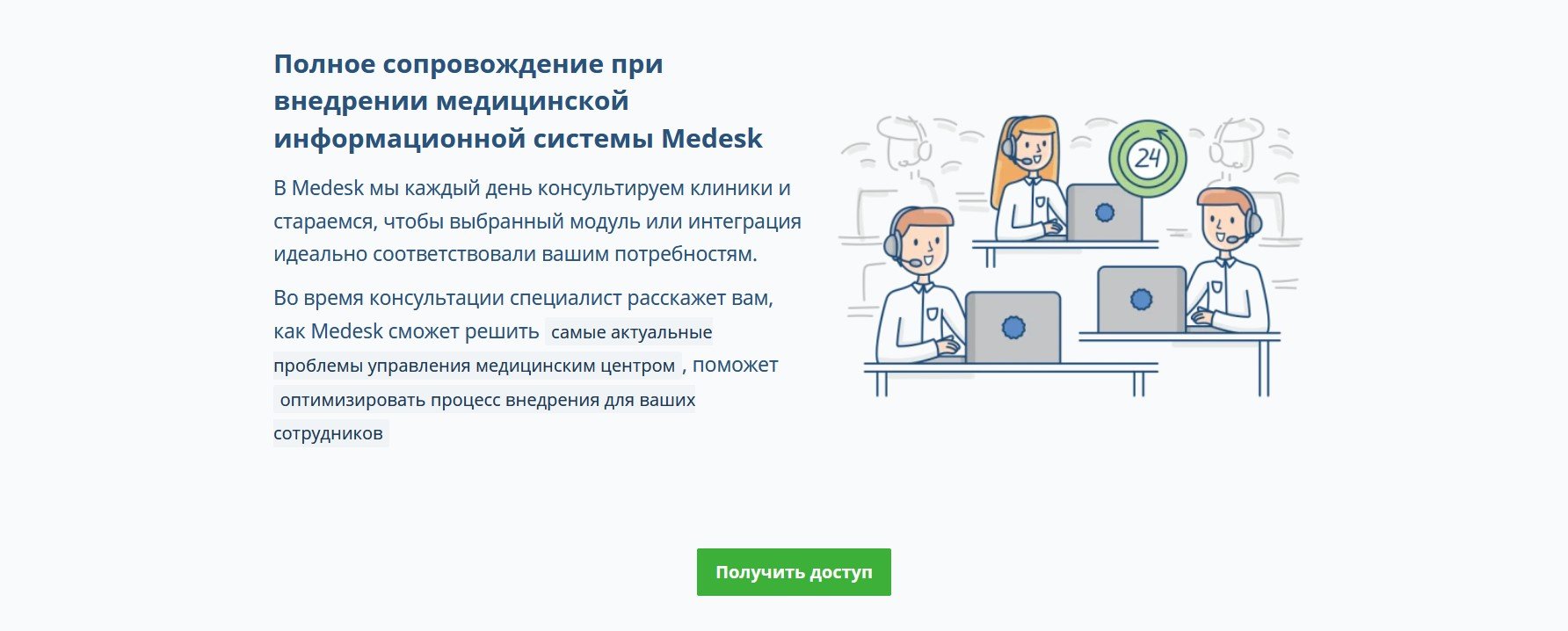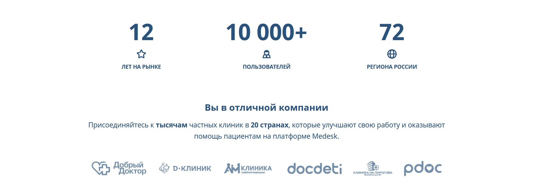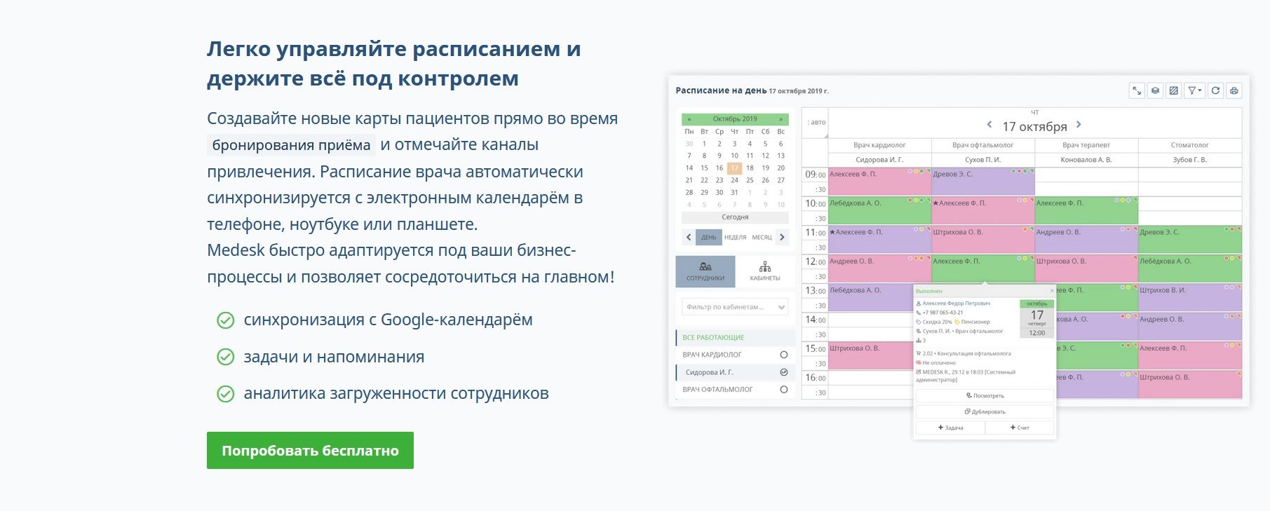 Medesk – это программное обеспечение, предназначенное для частных клиник и больниц. Создано специалистами-медиками. Сервис снижает рабочую нагрузку и упрощает работу с пациентами.