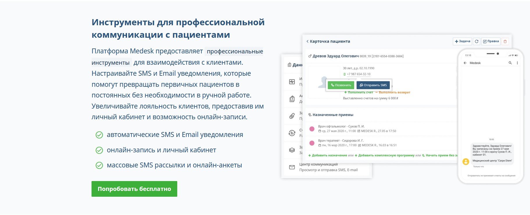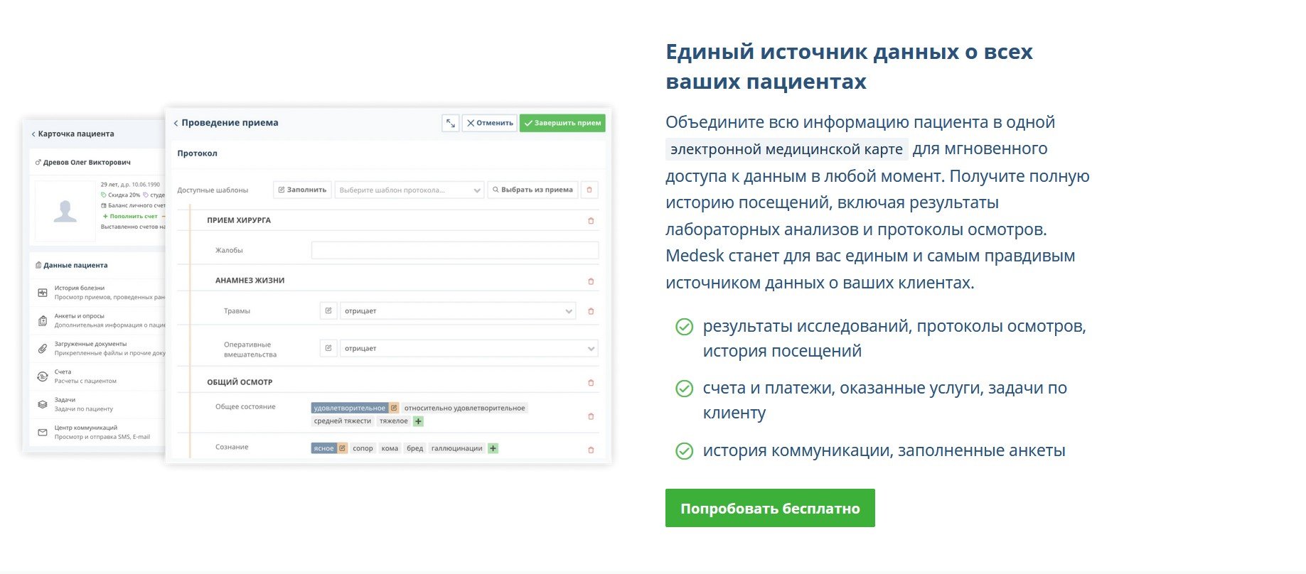 Medesk – специализированная CRM для частных клиник. Пациентам предоставляется личный кабинет, услуги телемедицины, онлайн-запись. Врачи могут электронно вести историю болезни. Администрация контролирует нагрузку, расписание, счета и отчетность по работе клиники.