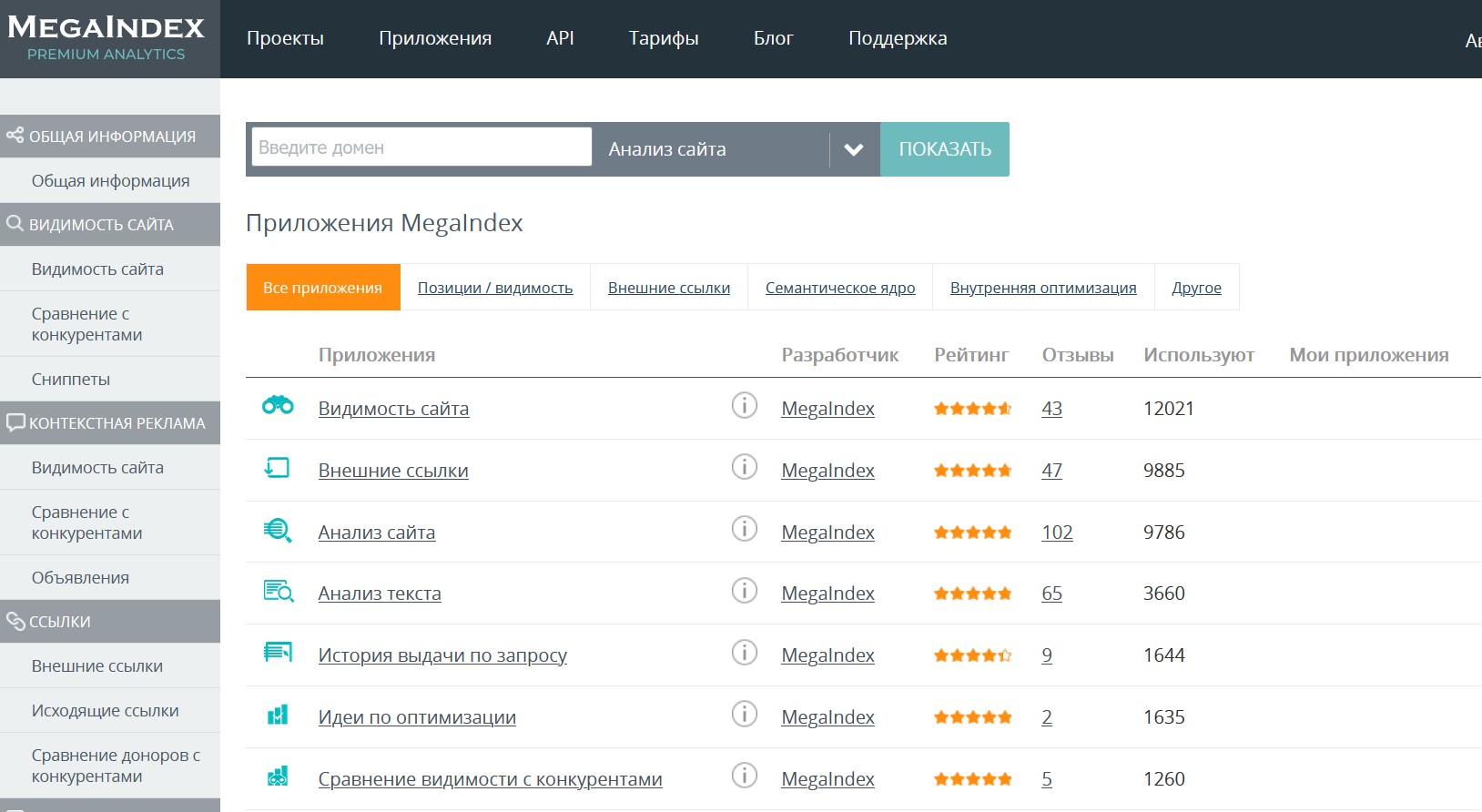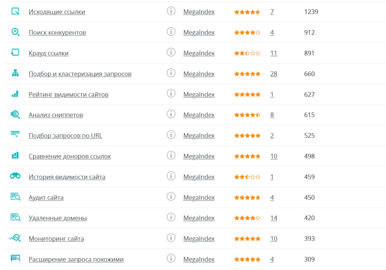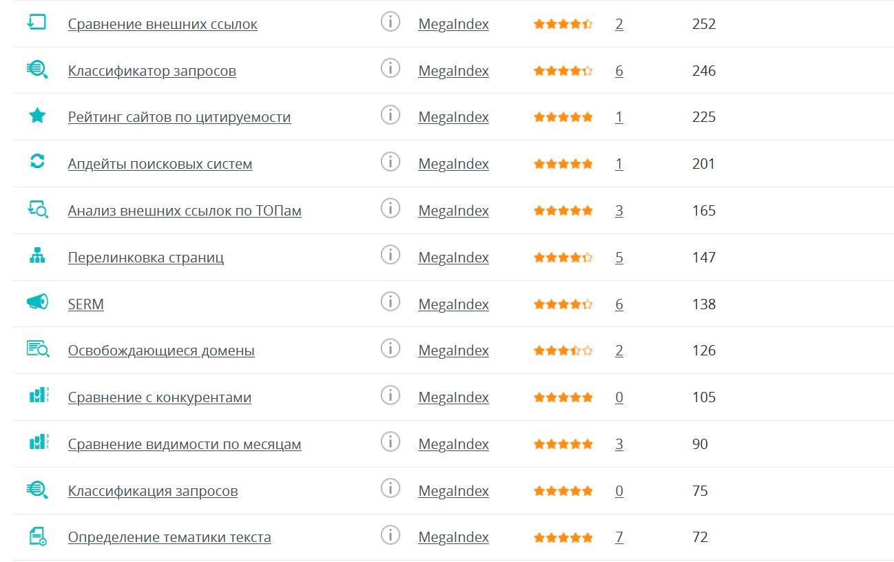 MegaIndex помогает узнать позиции своего сайта и сравнить себя с конкурентами по многим параметрам. Его функции включают доступ к приложениям, отчеты и аналитику, кластеризацию запросов, мониторинг сайта, автоматическое продвижение, доступ к API и многое другое. Более 400 тыс. пользователей уже используют сервис, работающий с 2008 года.