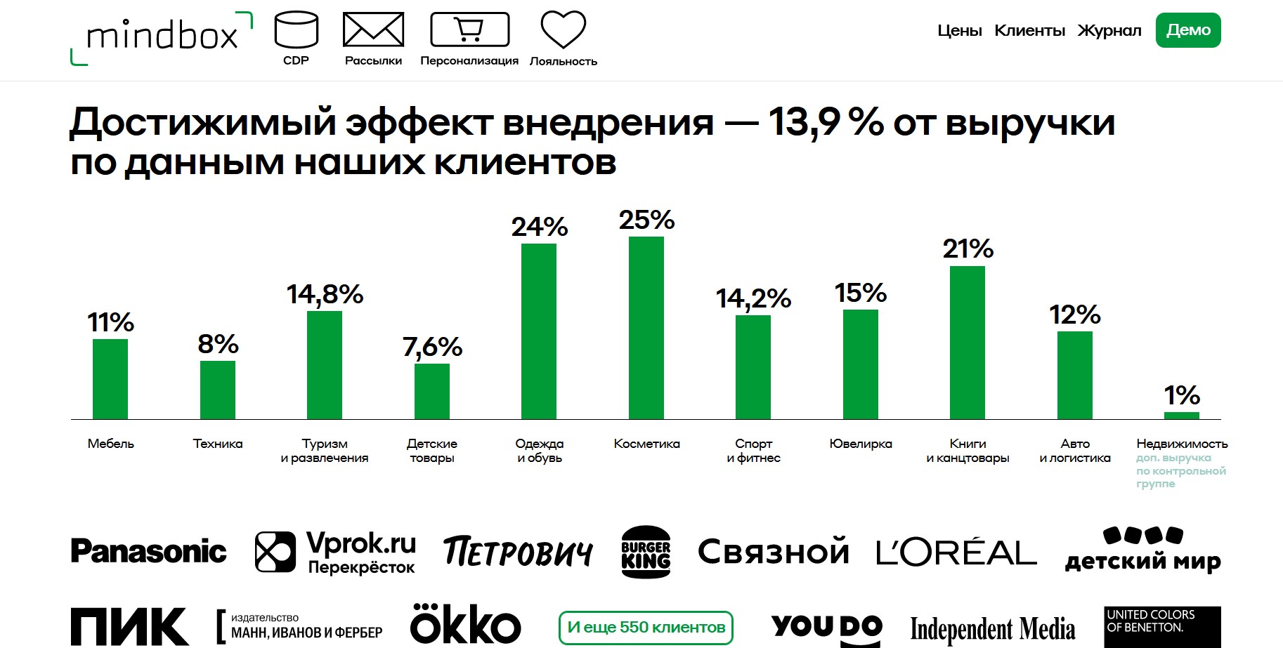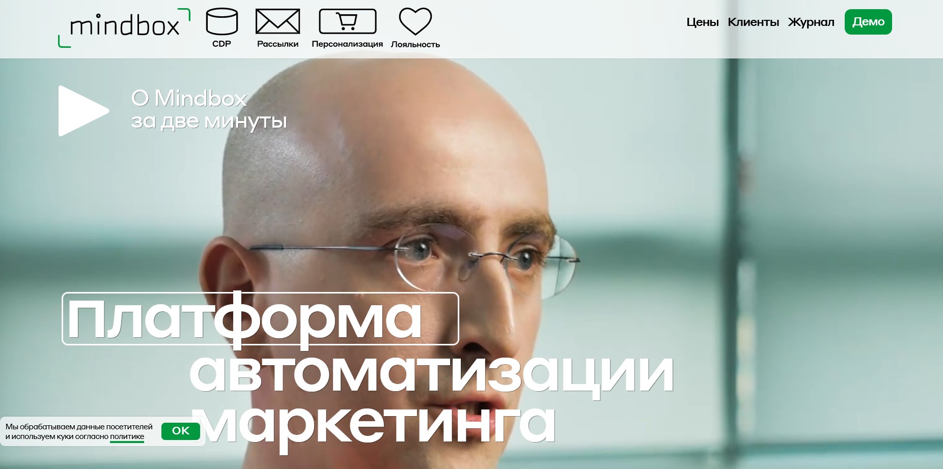 MindBox – CDP платформа (платформа клиентских данных), сервис автоматизации маркетинга. Помогает достичь высокой персонализации за счет комплекса рекламных технологий и единой платформы клиентских данных. Сервис используют крупнейшие клиенты – рекламодатели и маркетинговые агентства.