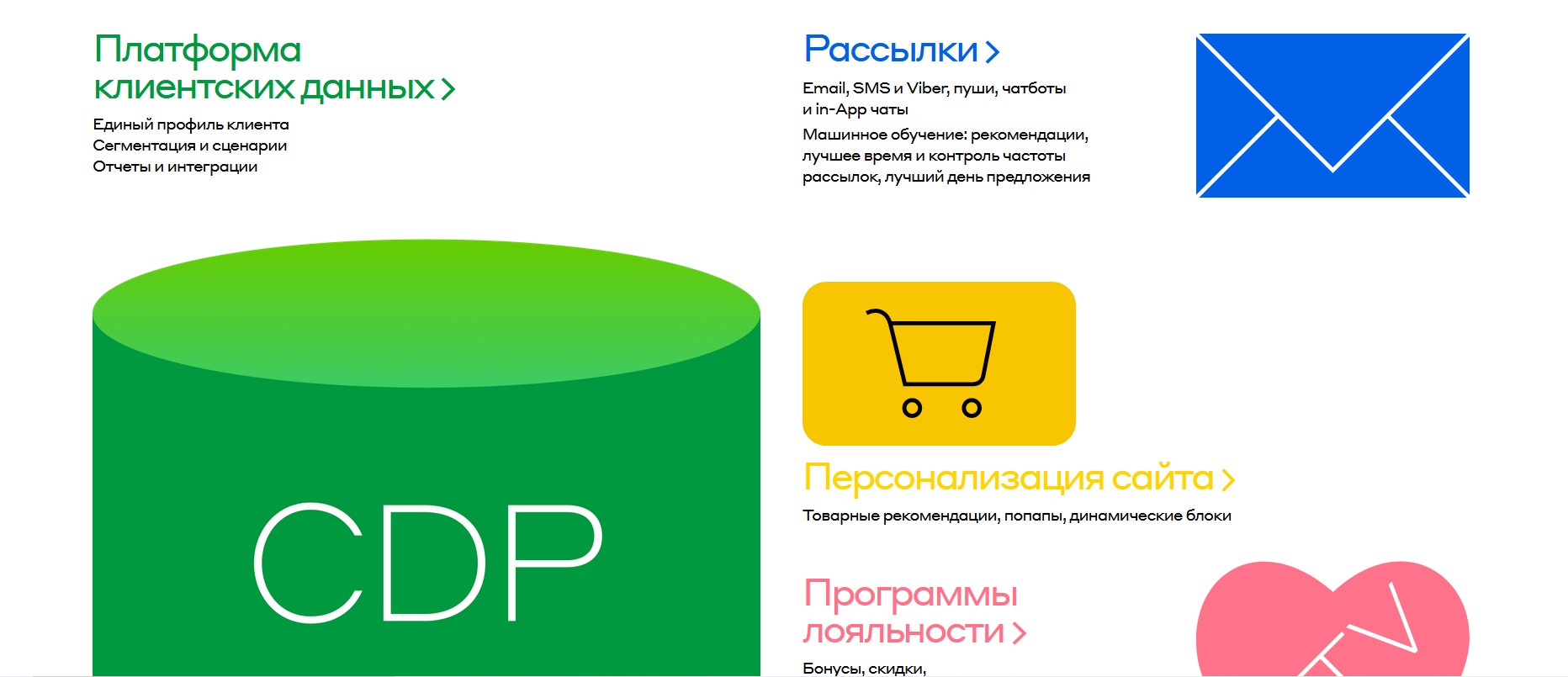 - Платформа клиентских данных – интеграция со всеми источниками для объединения в единую базу, создание общего профиля. Сегментация клиентов. Отчетность по клиентам.