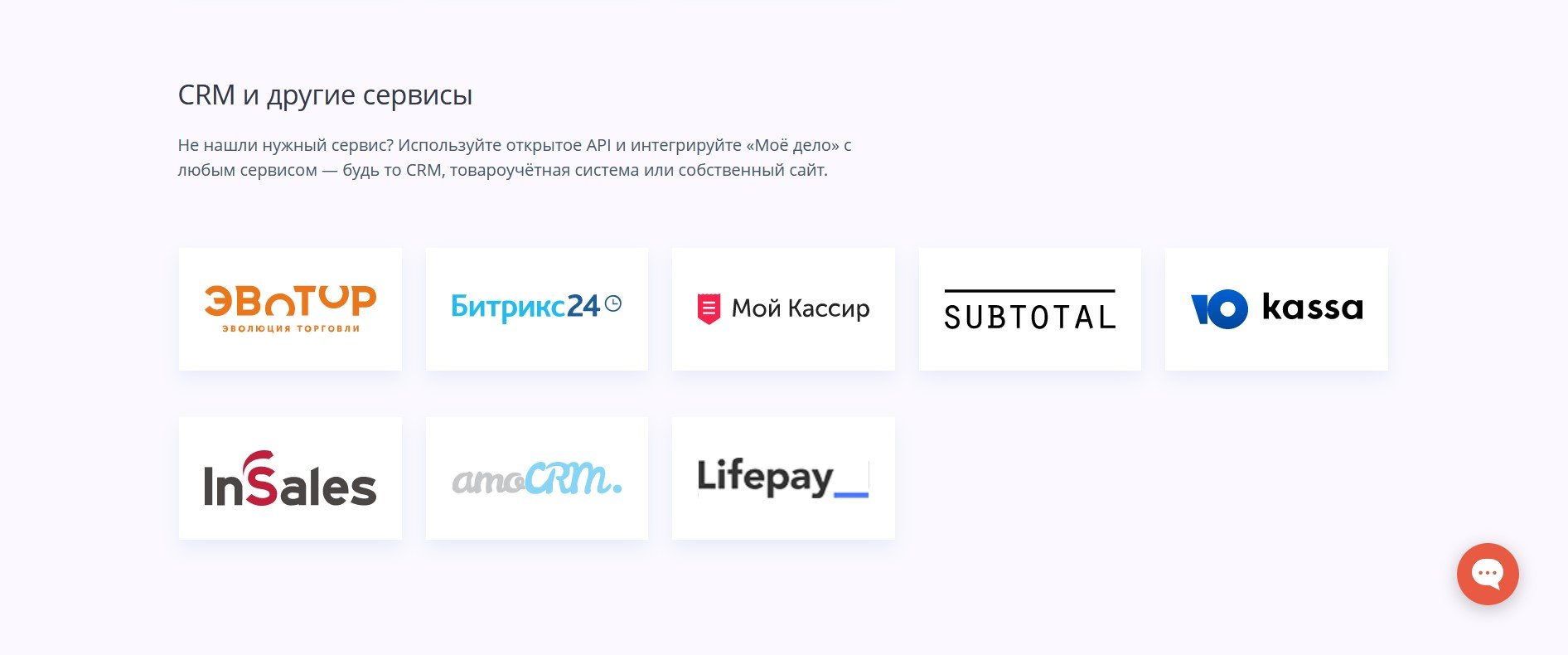 «Мое дело» – сервис бухгалтерского и финансового учета, предоставляющий функционал под любые потребности. Все операции, начиная с открытия бизнеса, можно вести онлайн. Подключить можно отдельный модуль или коробочную версию с полным сервисом. Для предпринимателей создана база знаний, тренинги, консультации. Использование сервиса гарантирует безопасность, все операции застрахованы.