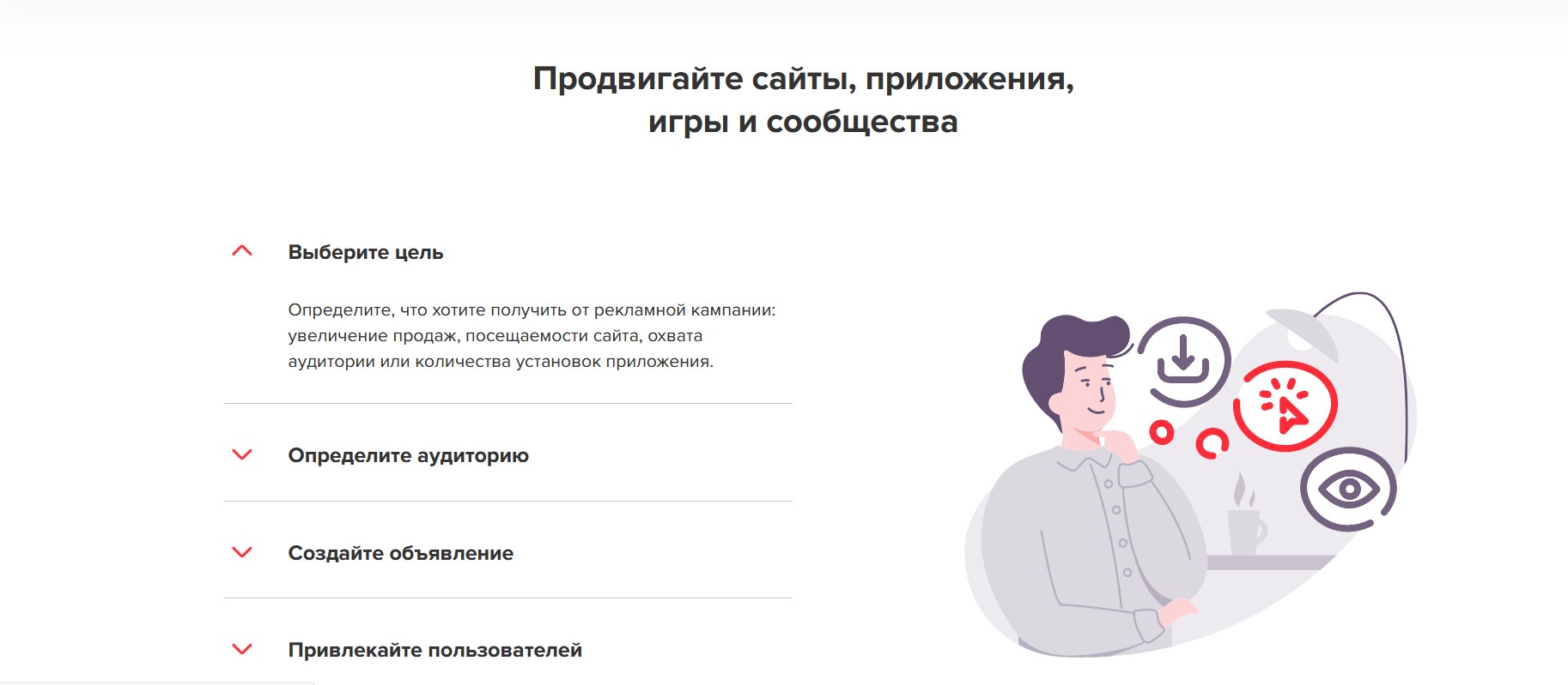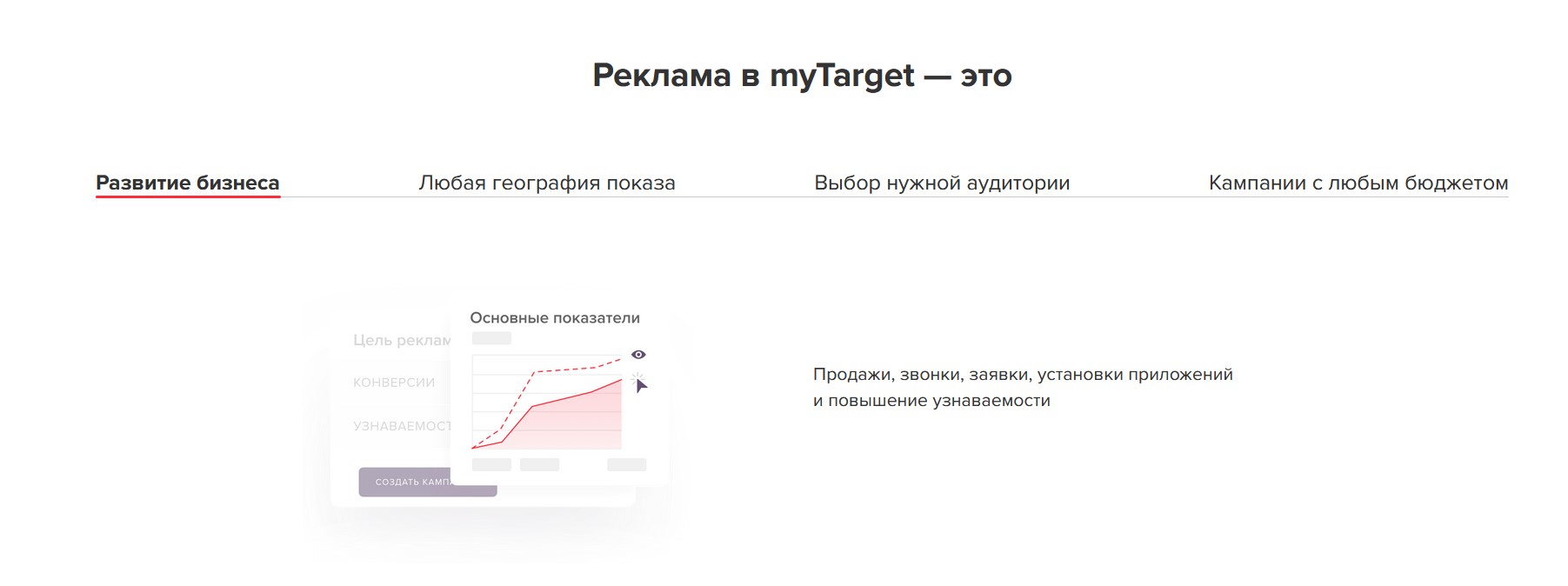 myTarget разместит рекламу для активной целевой аудитории в разных форматах. Пользователю нужно зарегистрироваться и в рекламном кабинете откроются все настройки рекламы по цели, охвату, аудитории, географии и времени показа. Для старта достаточно 600 рублей.