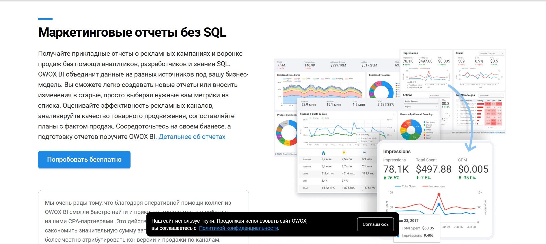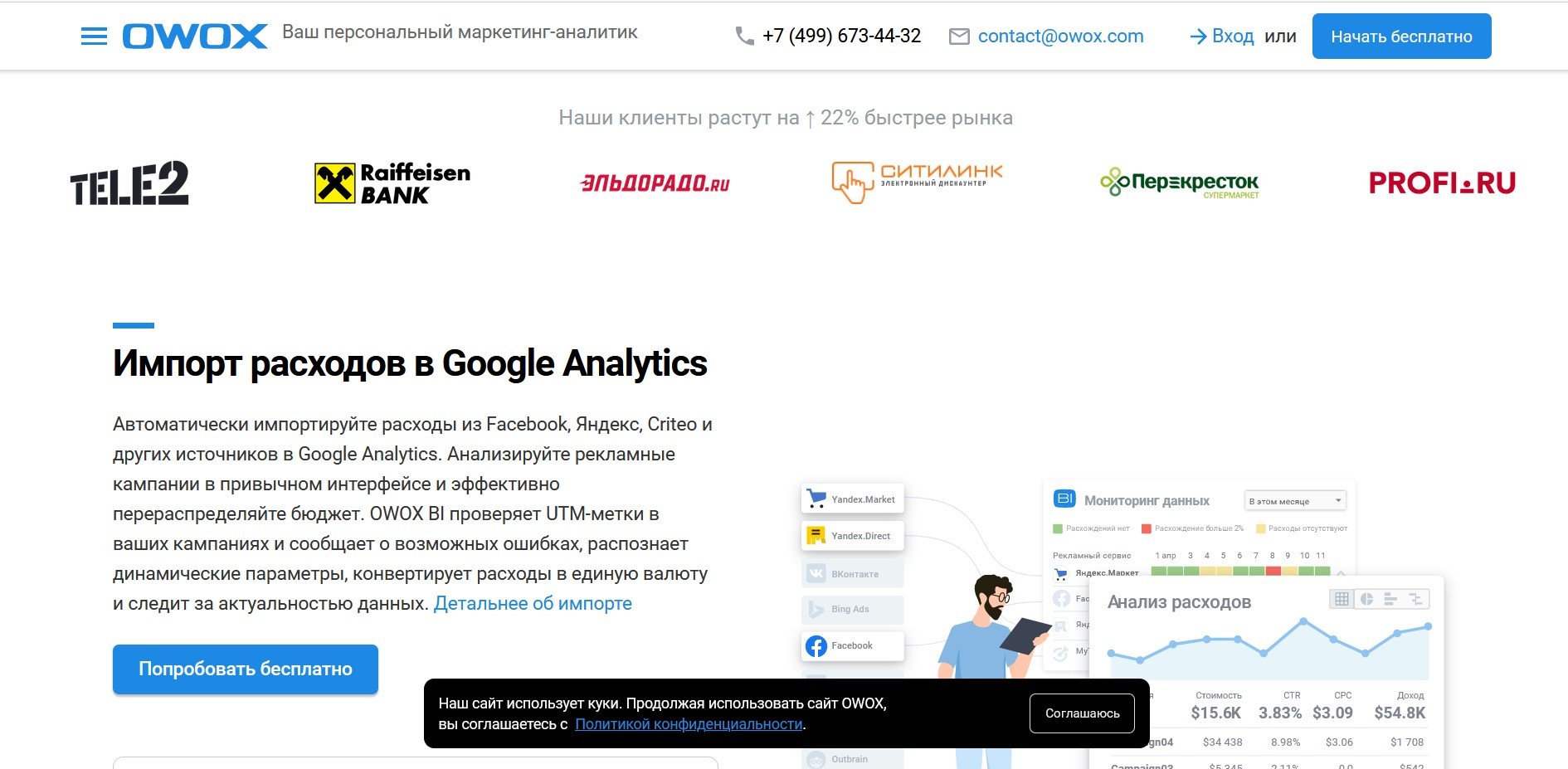 Использование маркетинга на основе данных позволяет не только опережать конкурентов, но и повышать лояльность клиентов к бренду. Сервис OWOX BI автоматически собирает маркетинговые данные, создает отчеты, на основе которых можно оптимизировать свой бюджет. Настройка и отчетность по KPI позволит отслеживать достижение целей.