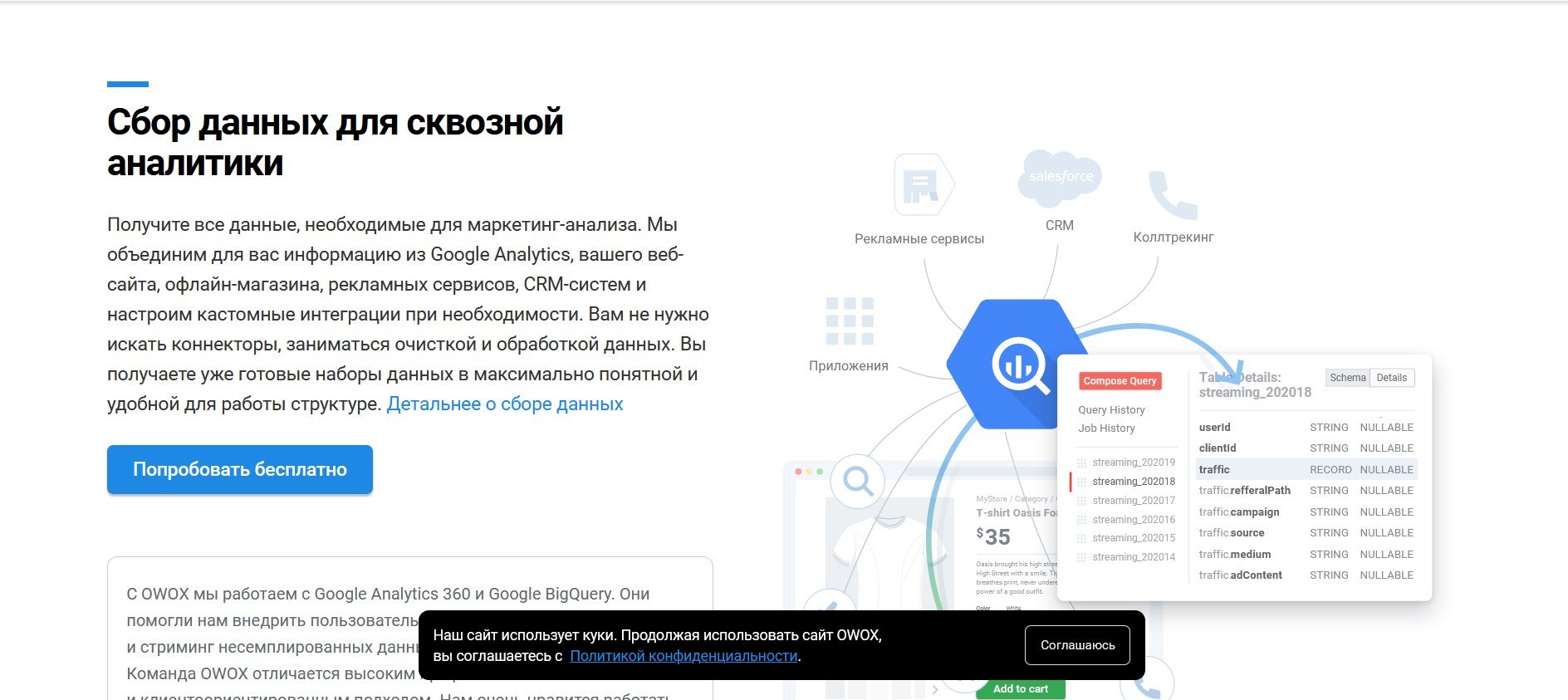 - OWOX BI BigQuery Report позволяет получить все данные, необходимые для расширенного маркетингового анализа. OWOX BI объединяет данные с веб-сайта, офлайн-магазина, системы Google Analytics, рекламных сервисов, коллтрекинга и CRM-систем. Не нужно делать интеграцию или вручную очищать и обрабатывать данные. Сервис дает возможность получить готовые наборы данных в максимально понятной и удобной структуре.