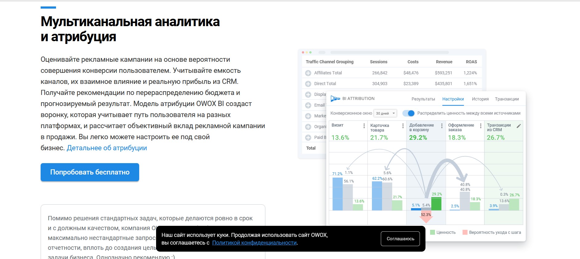 - Сервис OWOX BI рассчитывает вероятность покупки для каждого пользователя и помогает анализировать воронку продаж.