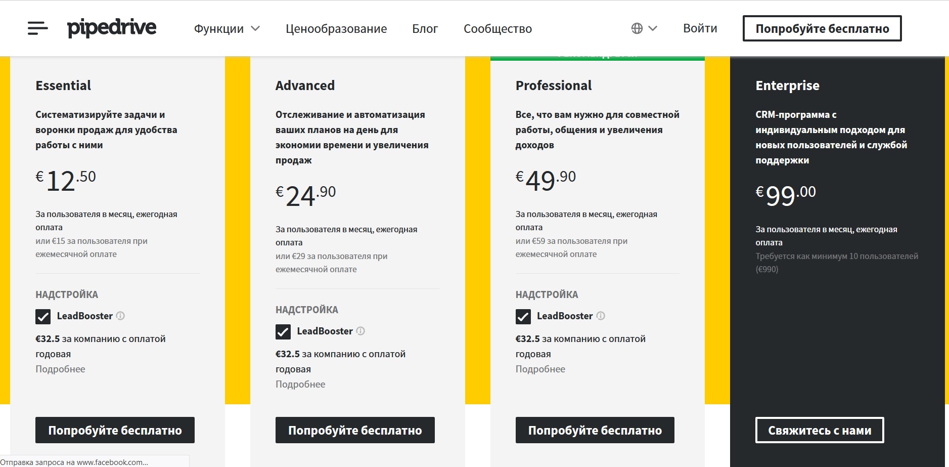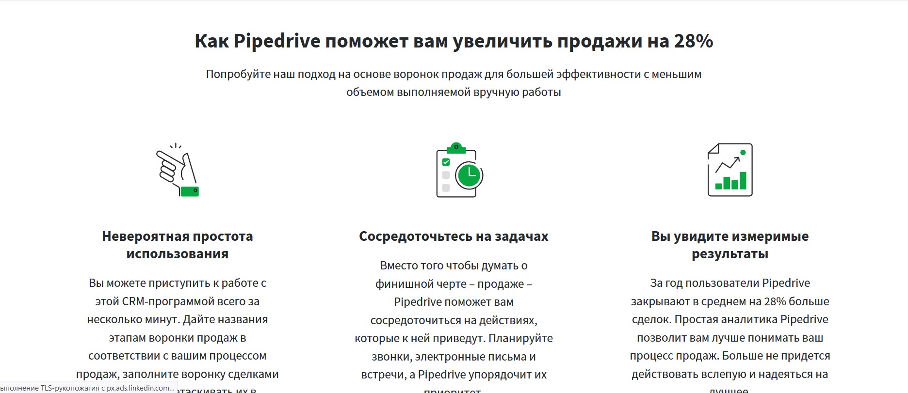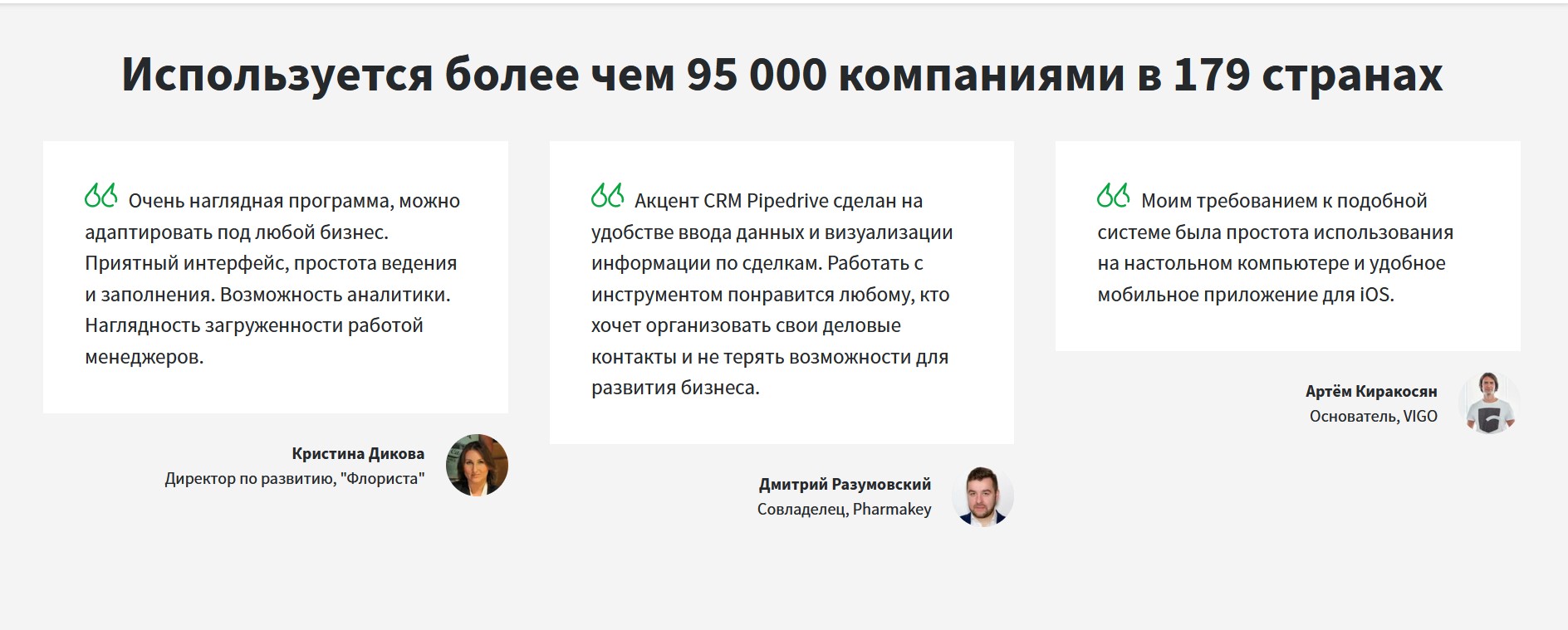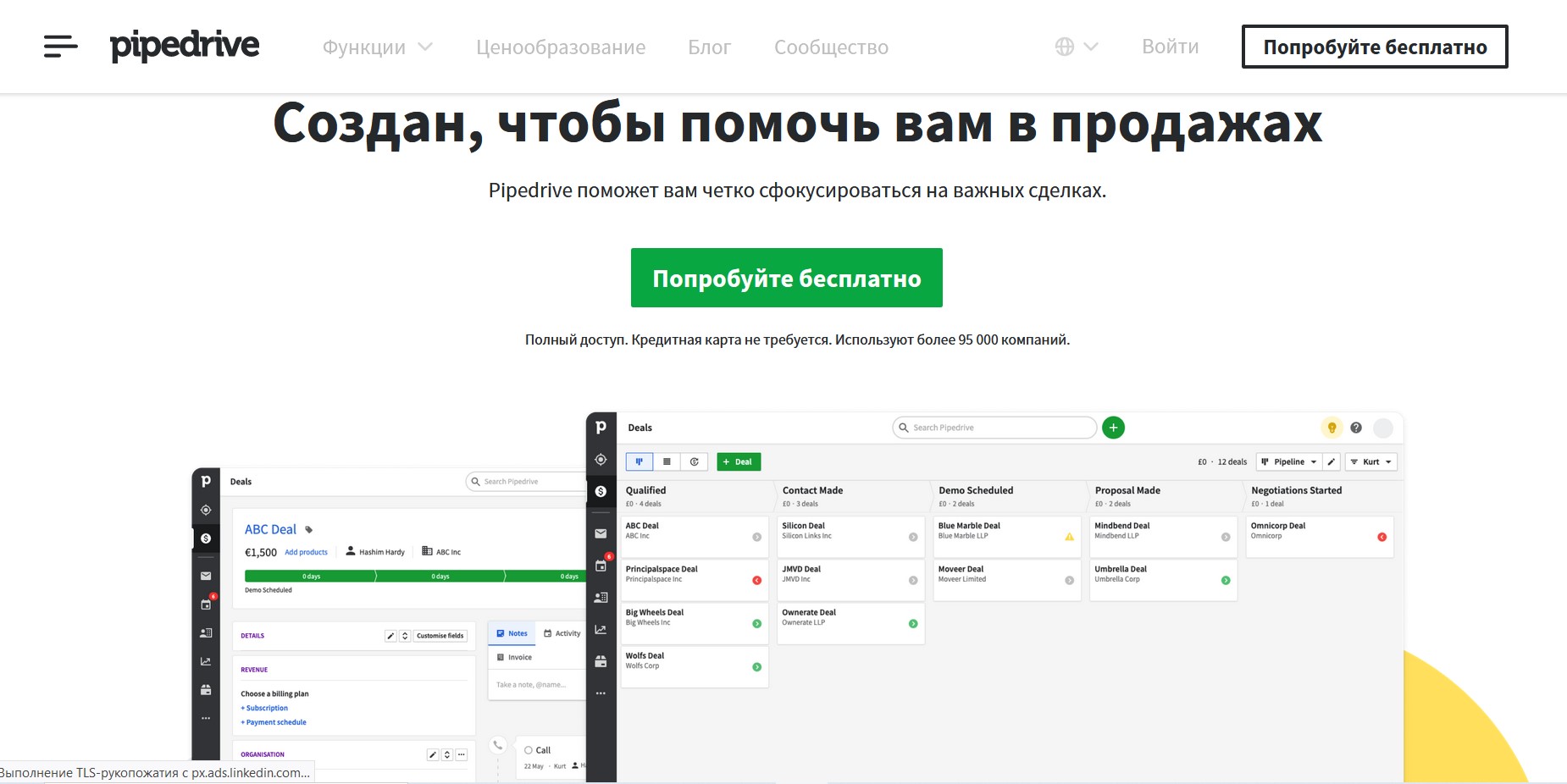 Платформа CRM Pipedrive создана в 2010 году и позволяет создавать воронку продаж, цели, собирать лиды и контакты, анализировать и прогнозировать сделки и доходы. Сервис сочетает функции коллтрекинга и CRM. Сейчас Pipedrive используется в 179 странах мира.