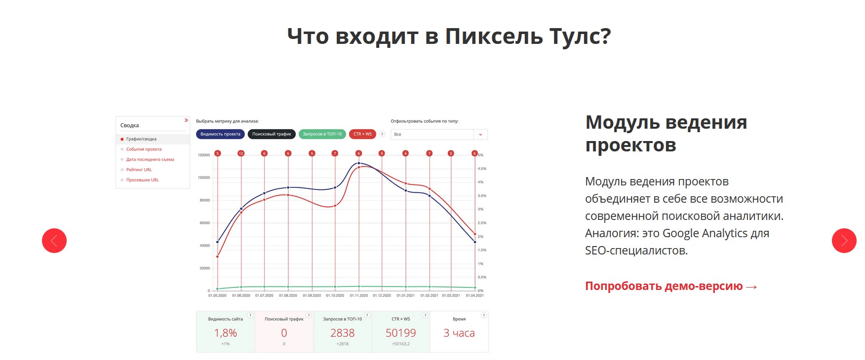 Пиксель Тулс – сервис SEO, который гарантирует рост трафика в 3 раза при соблюдении рекомендаций системы по итогам анализа. Экономия времени за счет автоматизации рутины и подключение специальных инструментов сохранят средства и повысят позиции сайта в выдаче.