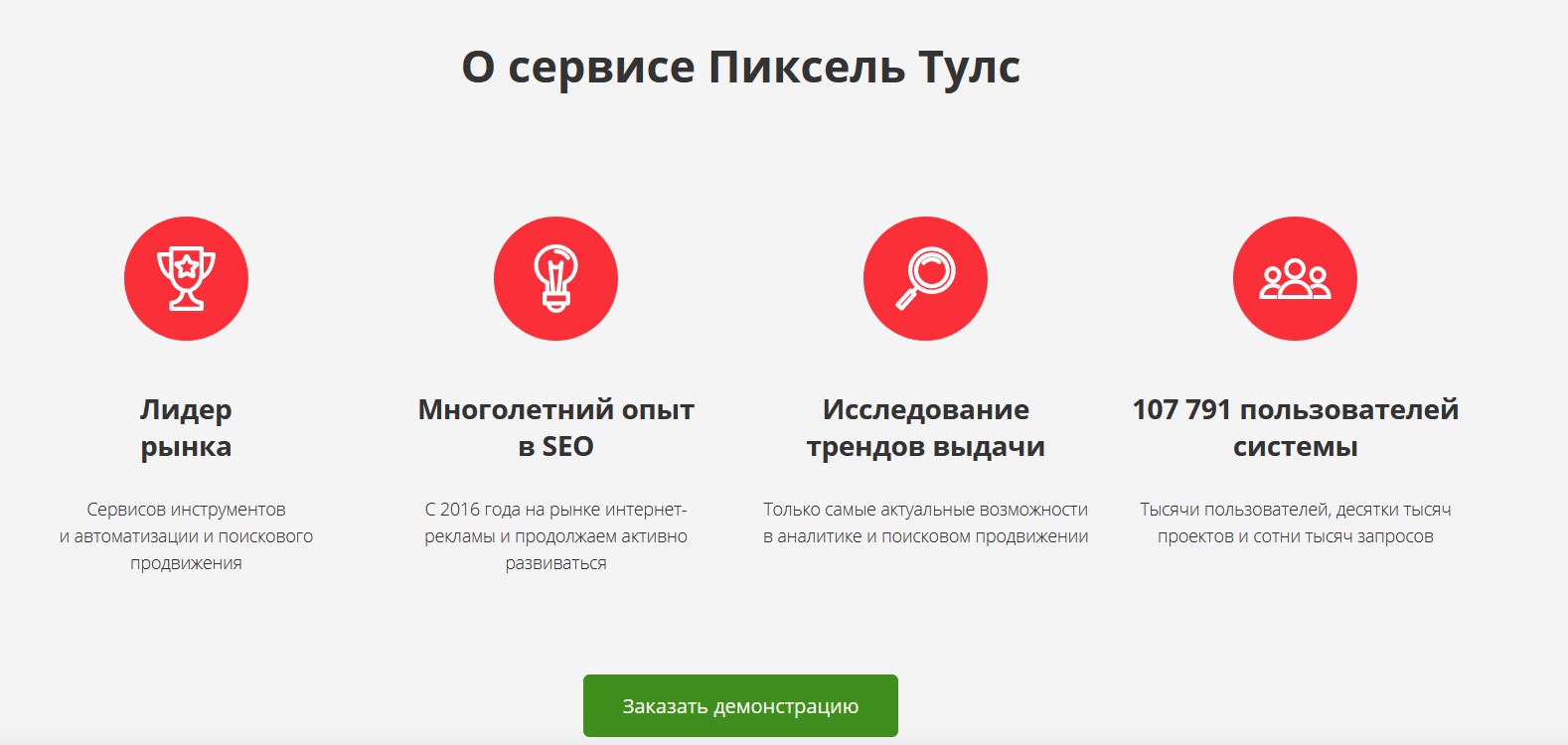 Пиксель Тулс – сервис SEO, который поможет повысить производительность специалистов, автоматизирует задачи и окупится (по информации самого сервиса) за месяц. Сервисом пользуются более 107 тыс. пользователей. Комплекс инструментов помогает объединить достоинства разных сервисов в один.