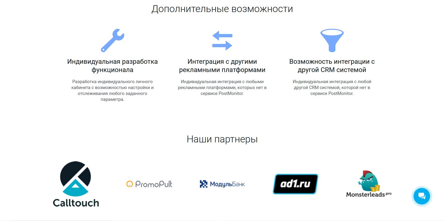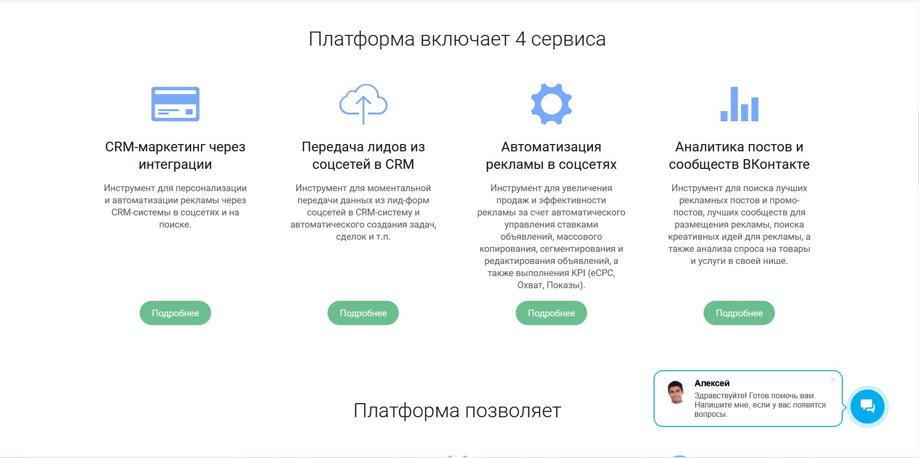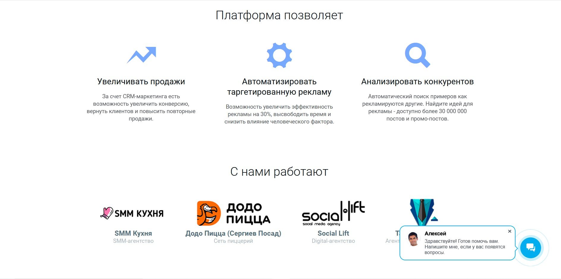 - Интеграция с рекламными кабинетами в соцсетях, запуск баннеров контекстной рекламы.