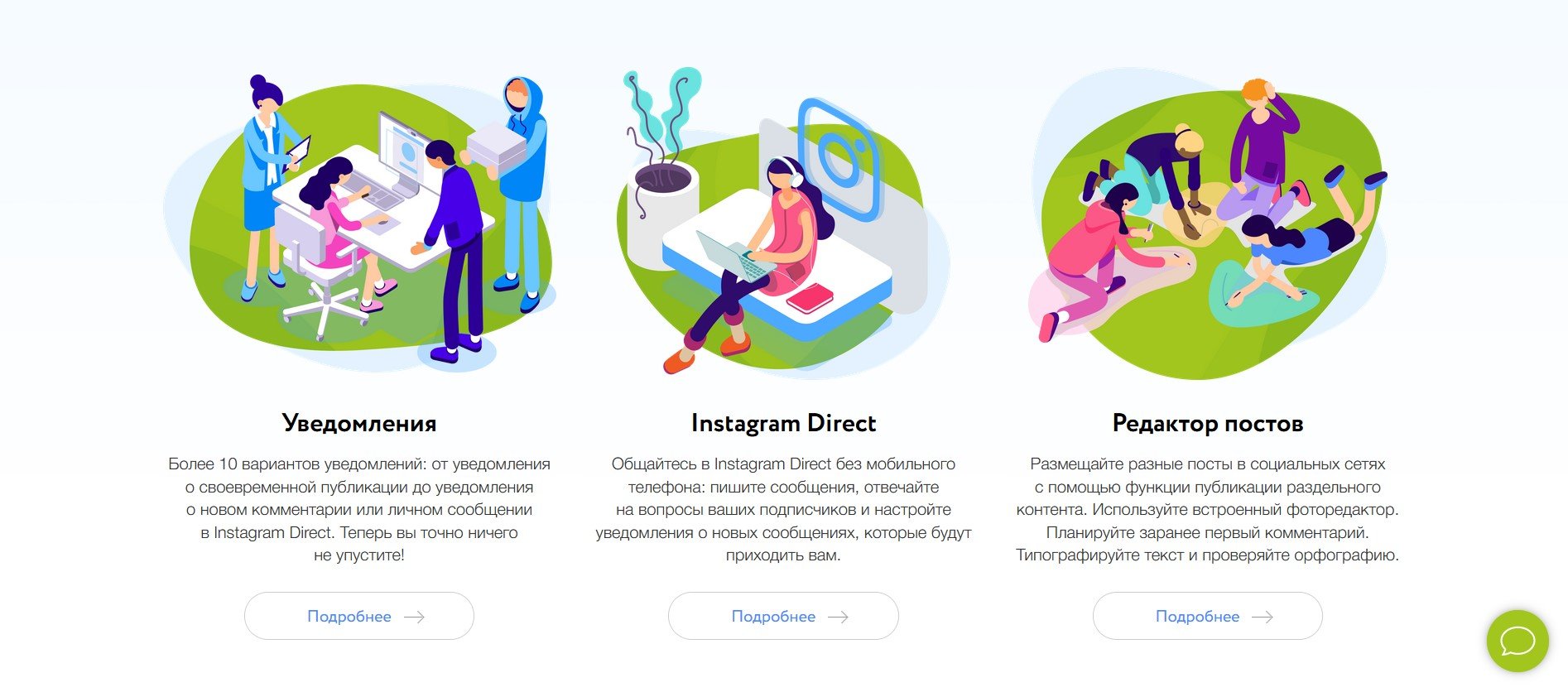 Нажав на кнопку «Возможности» в шапке сайта, пользователь может ознакомиться с анонсами всех функций сервиса.