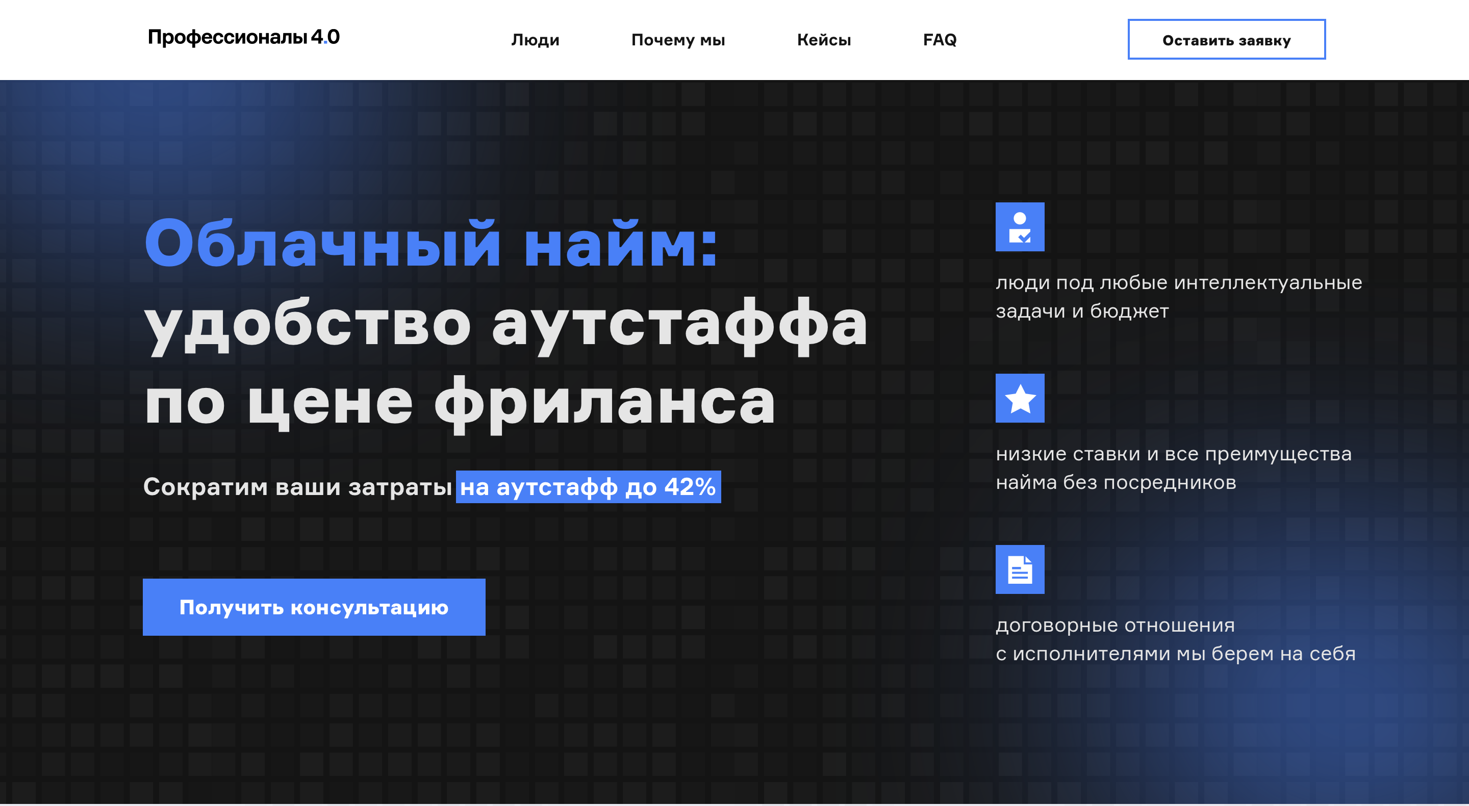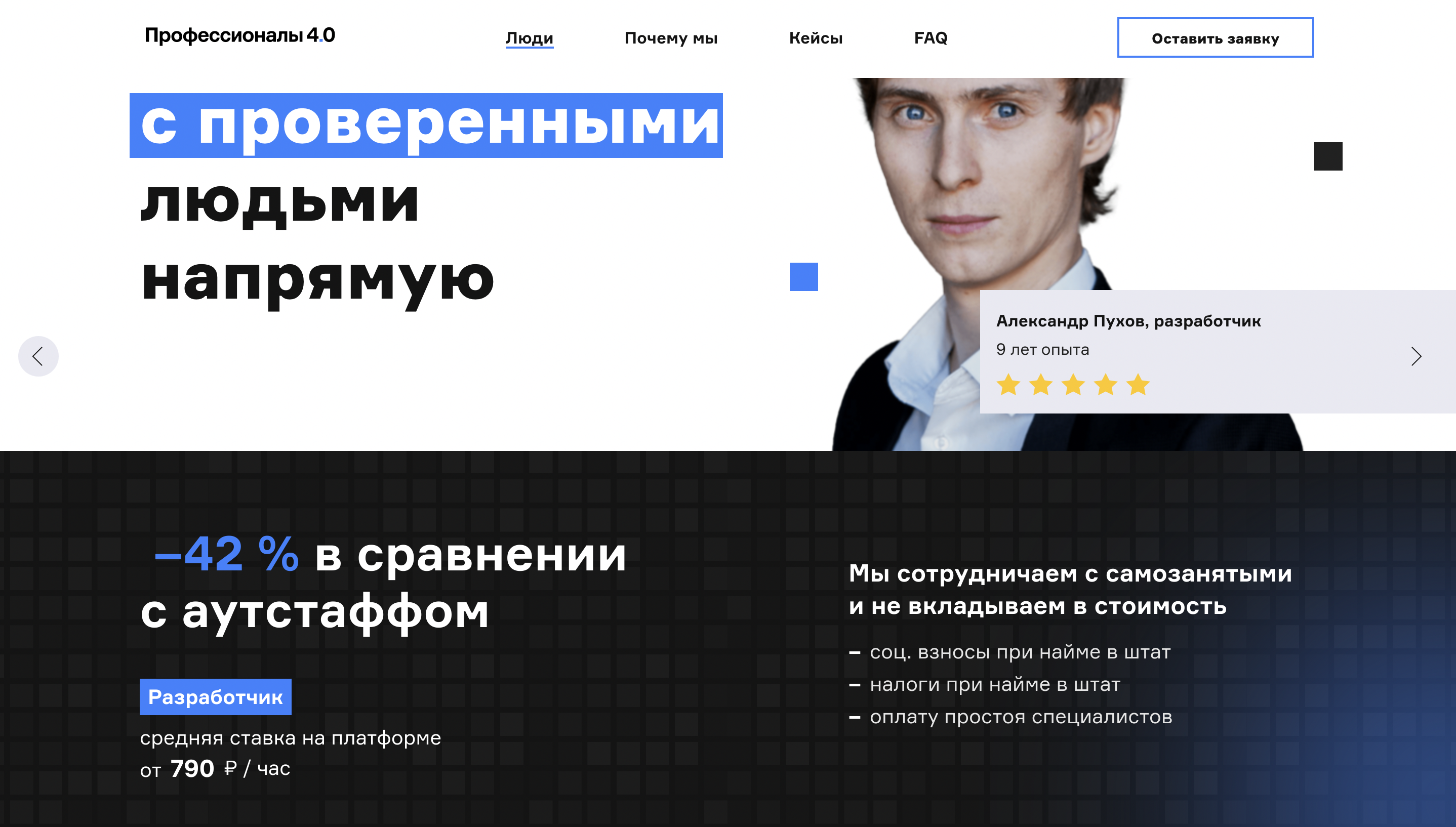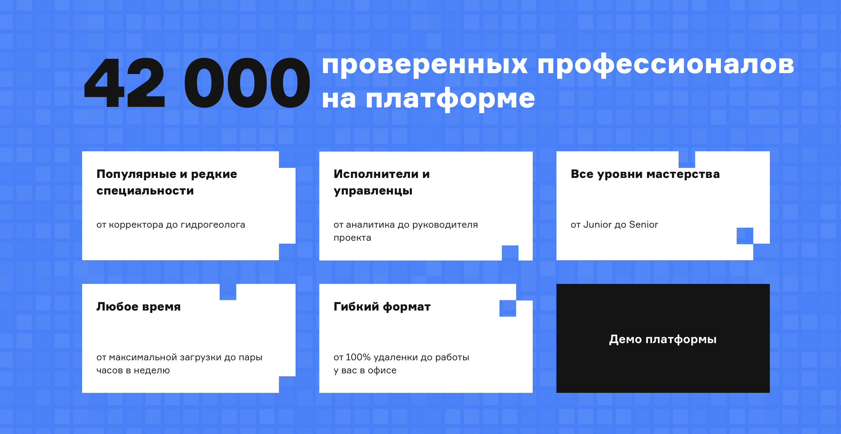 Платформа облачного найма: удобство аутстаффа по цене фриланса. Сервис подбирает команду под задачу в бюджете клиента, риски работы с фрилансерами берут на себя. Фрилансеры прошли проверку задачами Газпром нефти, Сибура и Росатома.