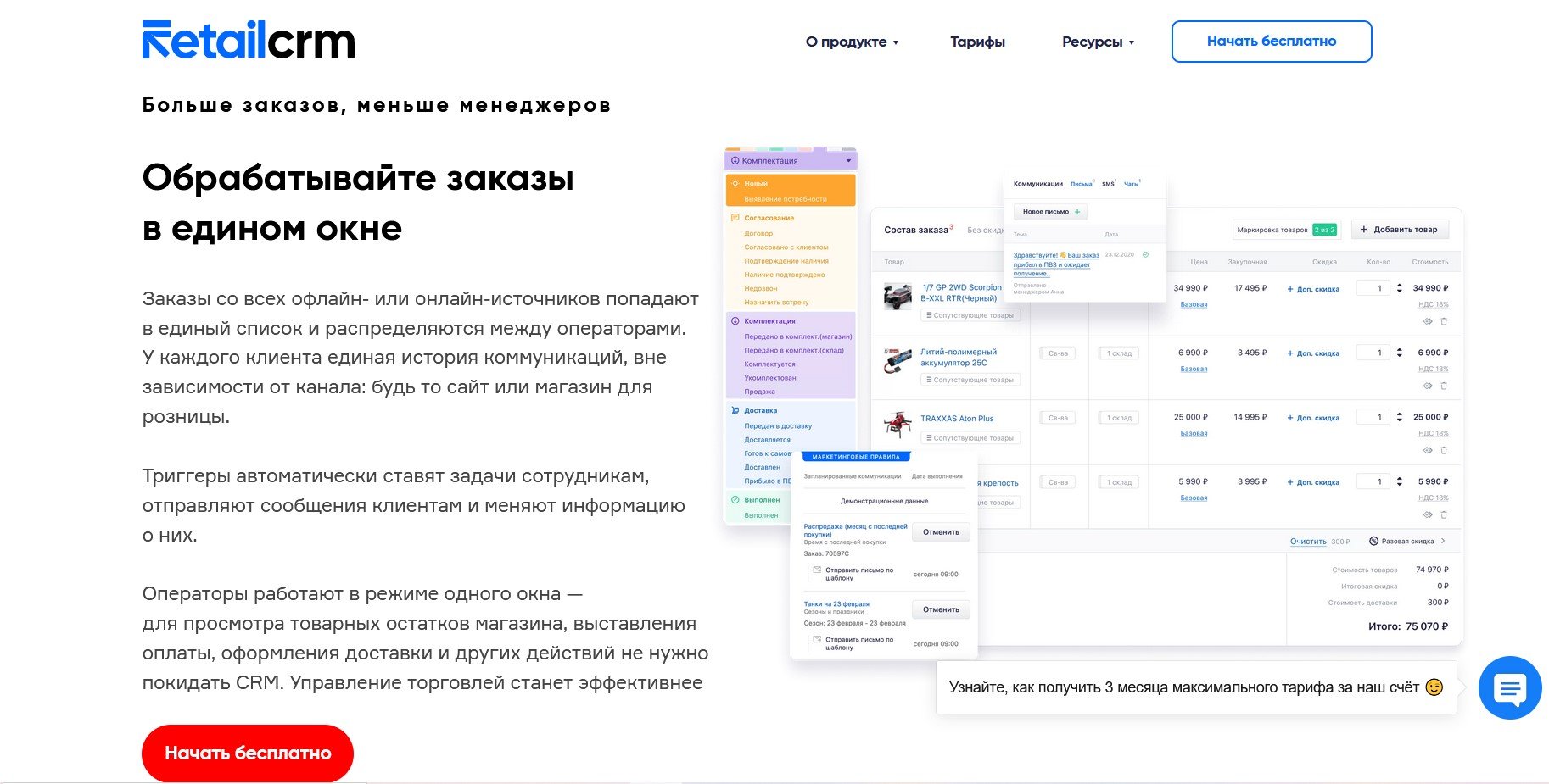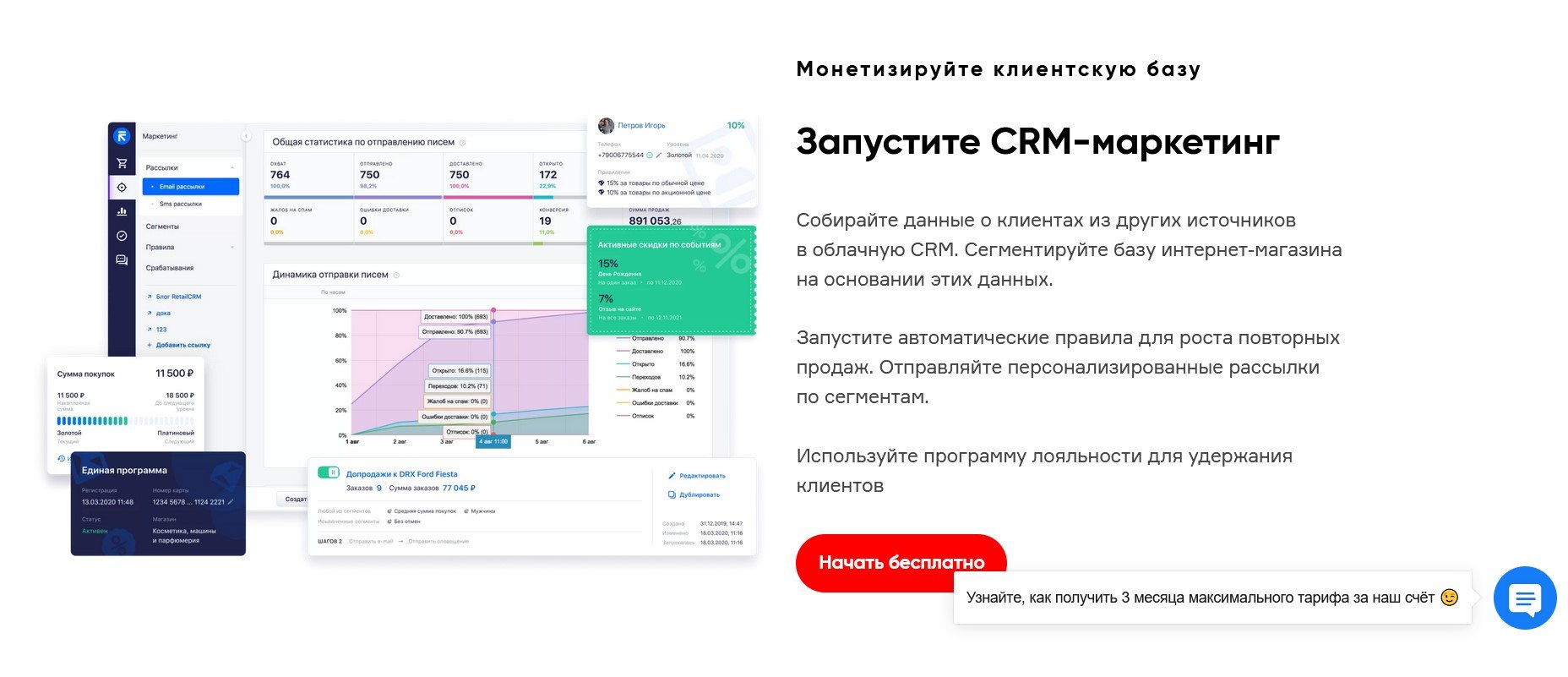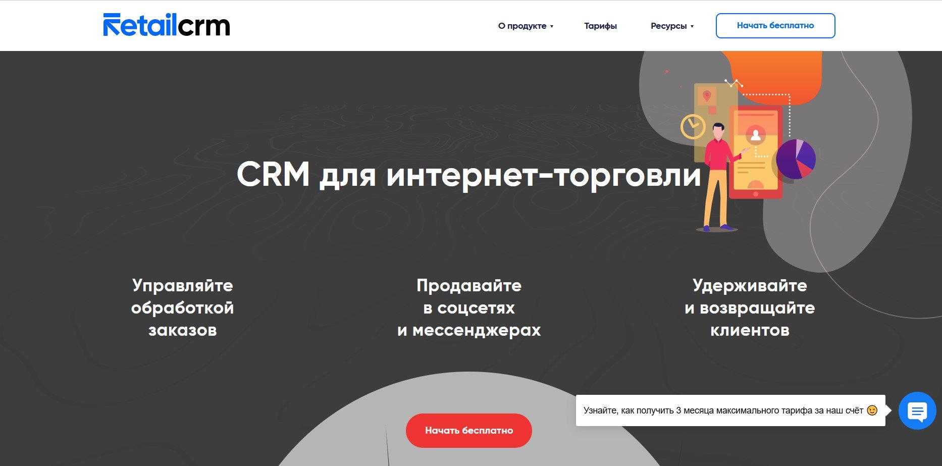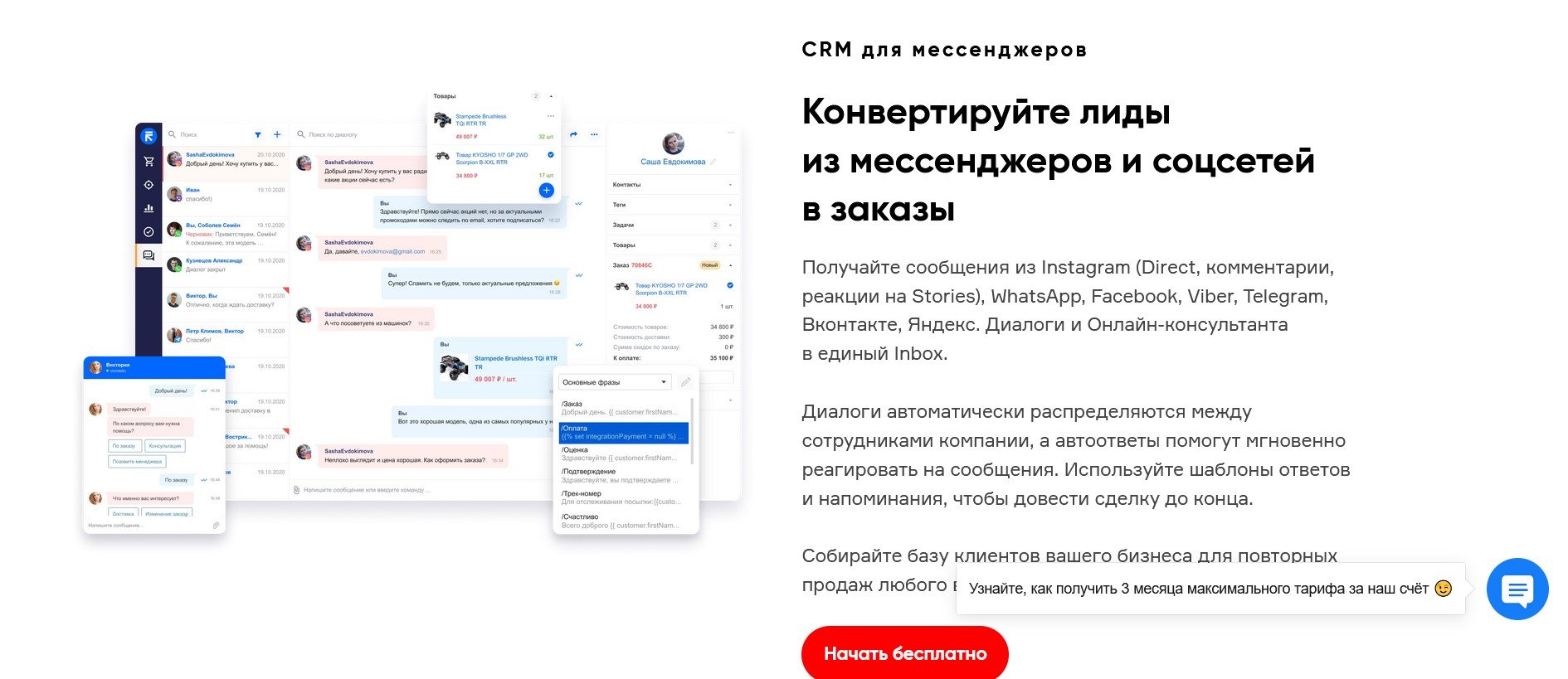 RetailCRM соединит онлайн и офлайн магазин и поможет продавать через Инстаграм и мессенджеры с миниCRM. Сочетает в себе управление клиентами, счетами, товаром и маркетингом. Для клиентов можно настраивать рассылки и создать программу лояльности.