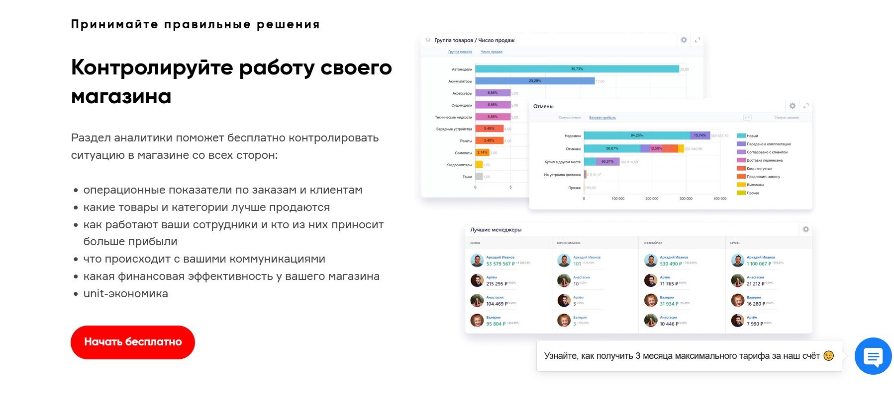 - Аналитика продаж, товаров, категорий, расчет финансовой эффективности и оценка работы сотрудников.