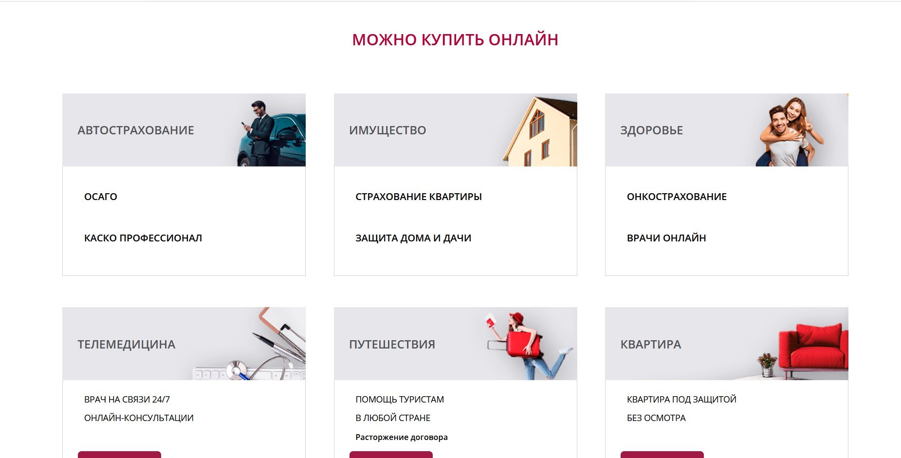 Сегодня компания предлагает более 50 различных видов страхования для физических и юридических лиц. В онлайн режиме можно купить целый ряд полисов и услуг: автостраховку, туристическую страховку, страхование недвижимости, телемедицинские услуги, страхование риска COVID-19.