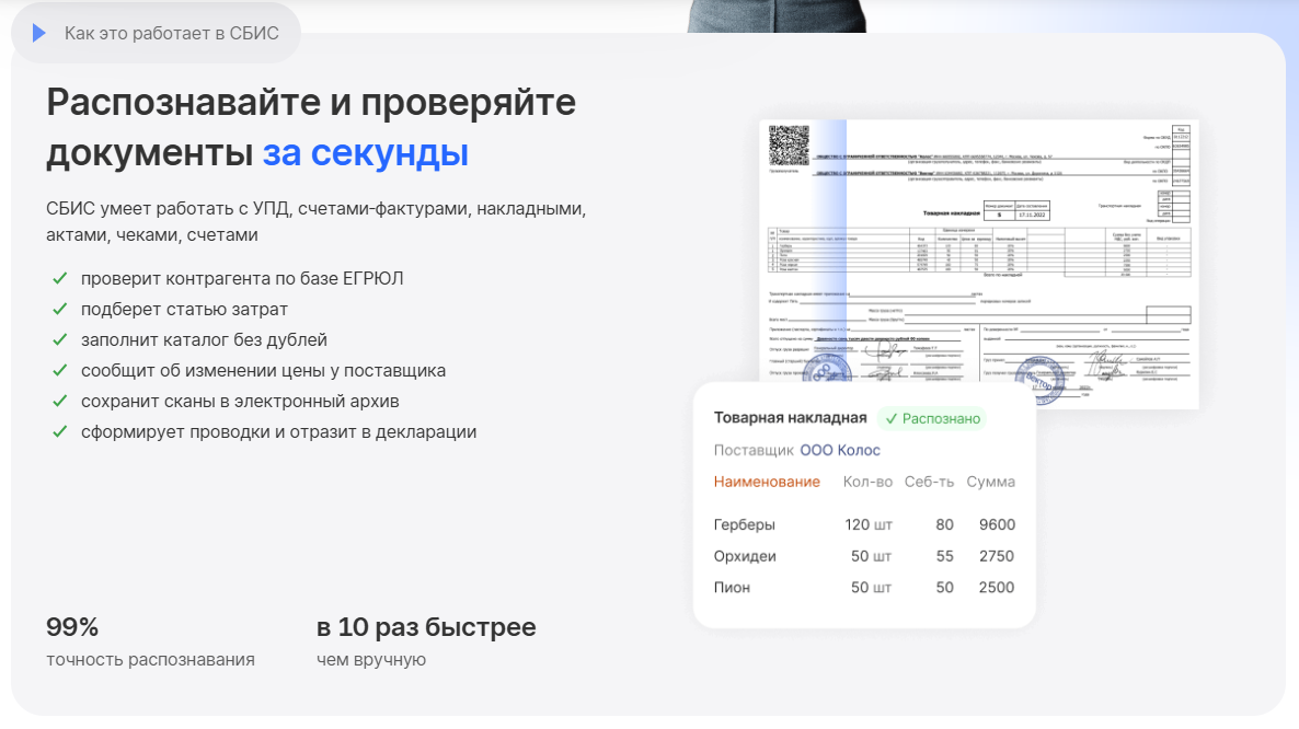 – Распознавание документов по фото или скану (УПД, счета, паспорт, СНИЛС)