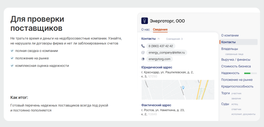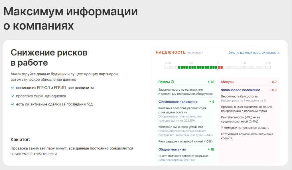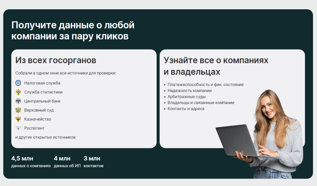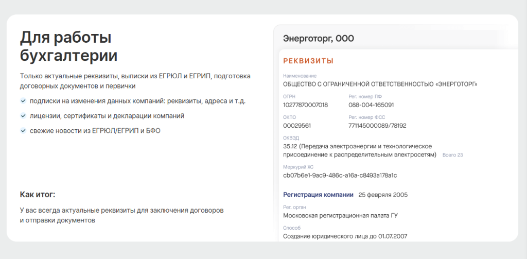 – Бухгалтерам: Предоставит актуальные реквизиты, выписки из ЕГРЮЛ и ЕГРИП. Подскажет, если данные компаний изменились.