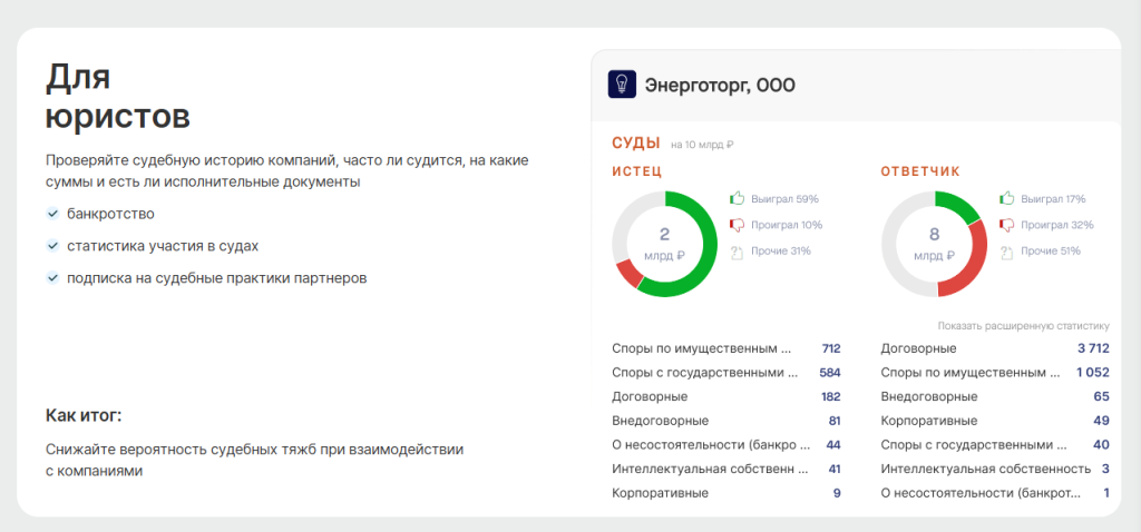 – Юристам: Проверит судебную историю, исполнительные документы, банкротства, статистику участия в судах.