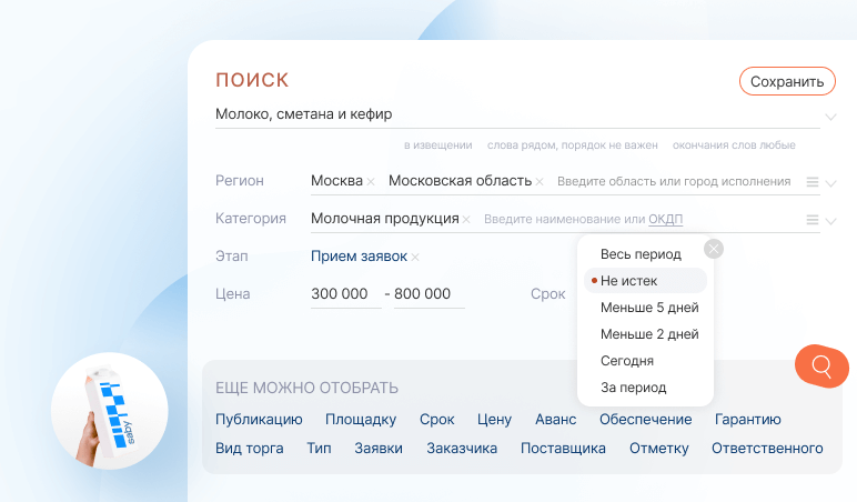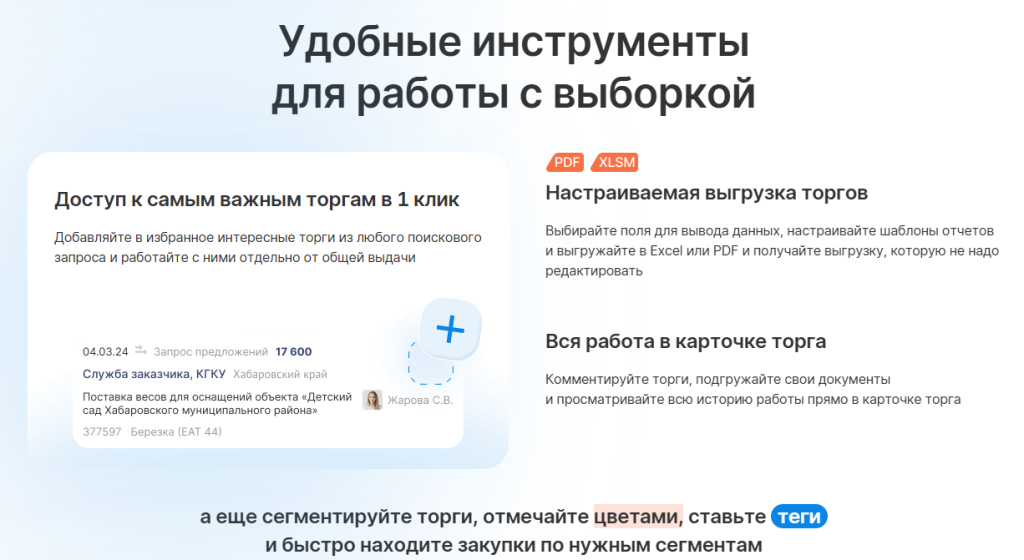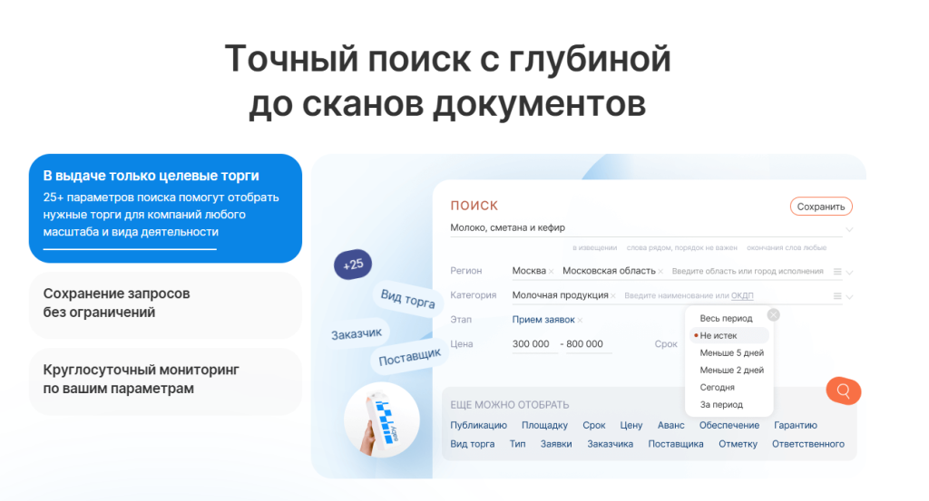 • Точный и глубокий отбор целевых торгов (регион, товар, услуга, сумма и др.)