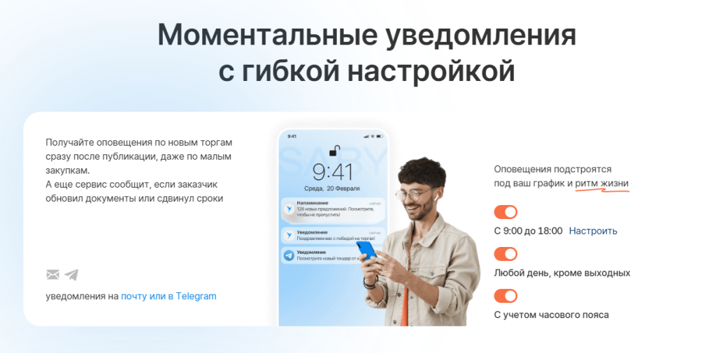 • Получайте моментальные уведомления о новых тендерах и изменениях условий по e mail, смс или через приложение.