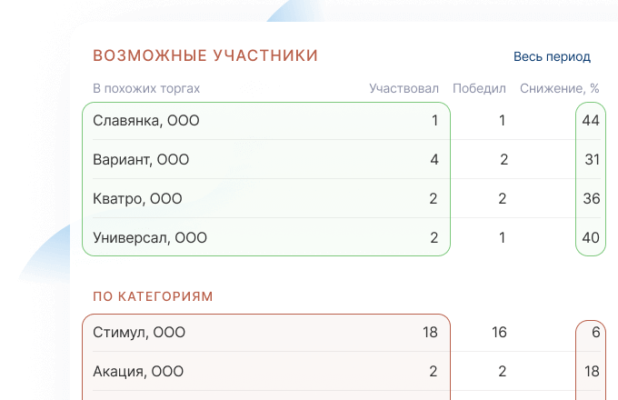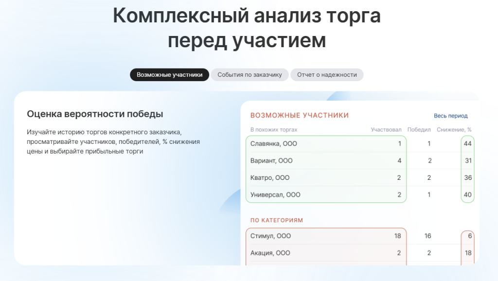 • Статистика конкурентов (победы, финальные цены) поможет принять решение о вашем участии.