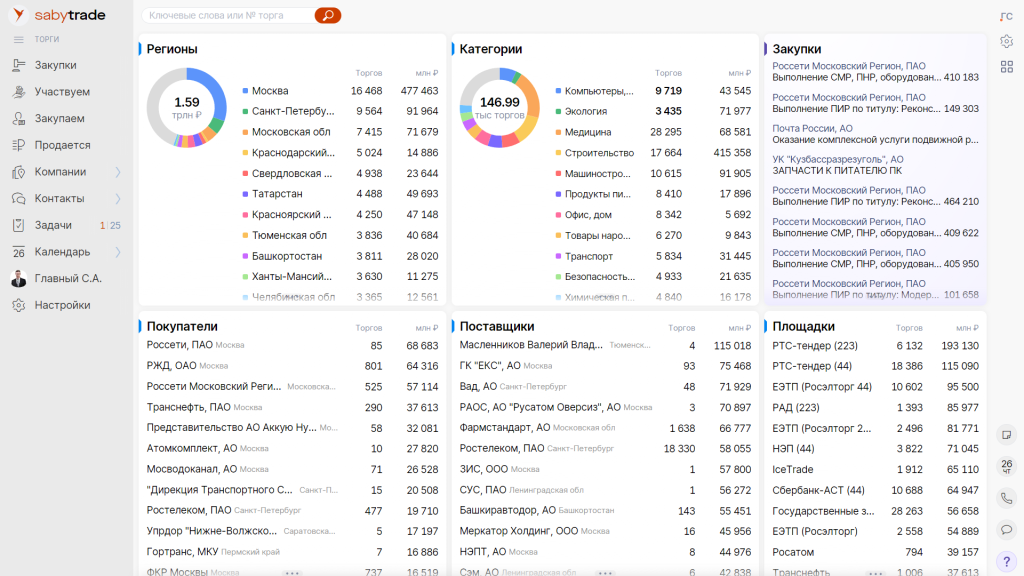 Saby Trade – решение для поставщиков в торгах, которое поможет зарабатывать, даже без опыта участий. Сбор торгов ведется со всех площадок, возможности поиска позволяют быстро отбирать подходящие торги, а понятная аналитика поможет выбрать наиболее прибыльные заказы.