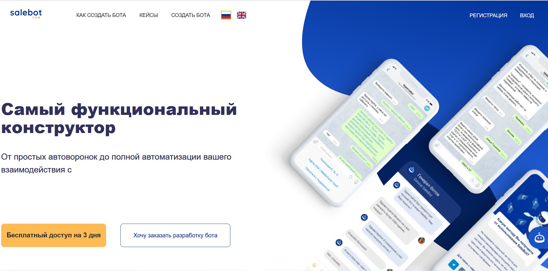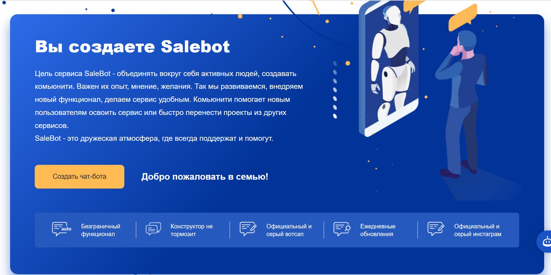 SaleBot – конструктор бота для начинающих и крупных предпринимателей. Предлагает встроенную CRM, сценарное конструирование диалога, удобные интеграции. Сервис предлагает готовые шаблоны, индивидуальное конструирование и услугу создания бота под ключ.