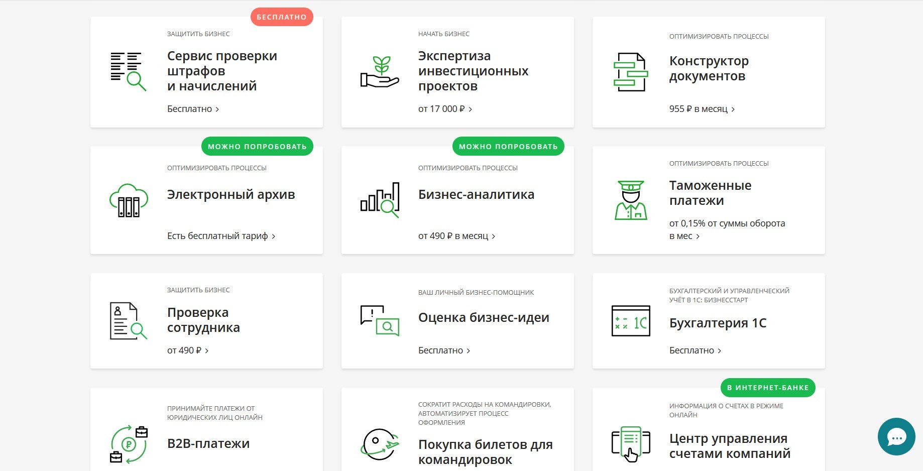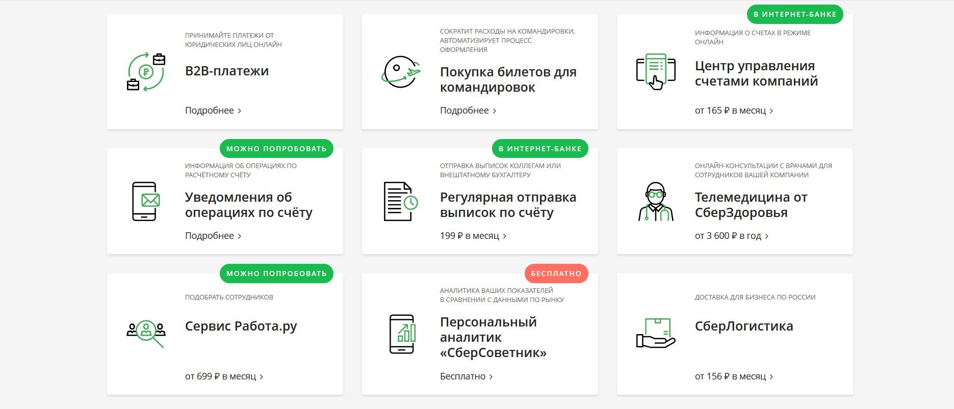 - Открытие расчетного счета онлайн. Есть три пакета, которые можно открыть: «Легкий старт» бесплатно с неограниченными платежами внутри Сбера, консультацией юриста и небольшой оплатой за переводы в другие банки, пакеты по абонентской плате с расширенным набором услуг «Полным ходом» и «Набирая обороты» для компаний с активной деятельностью.