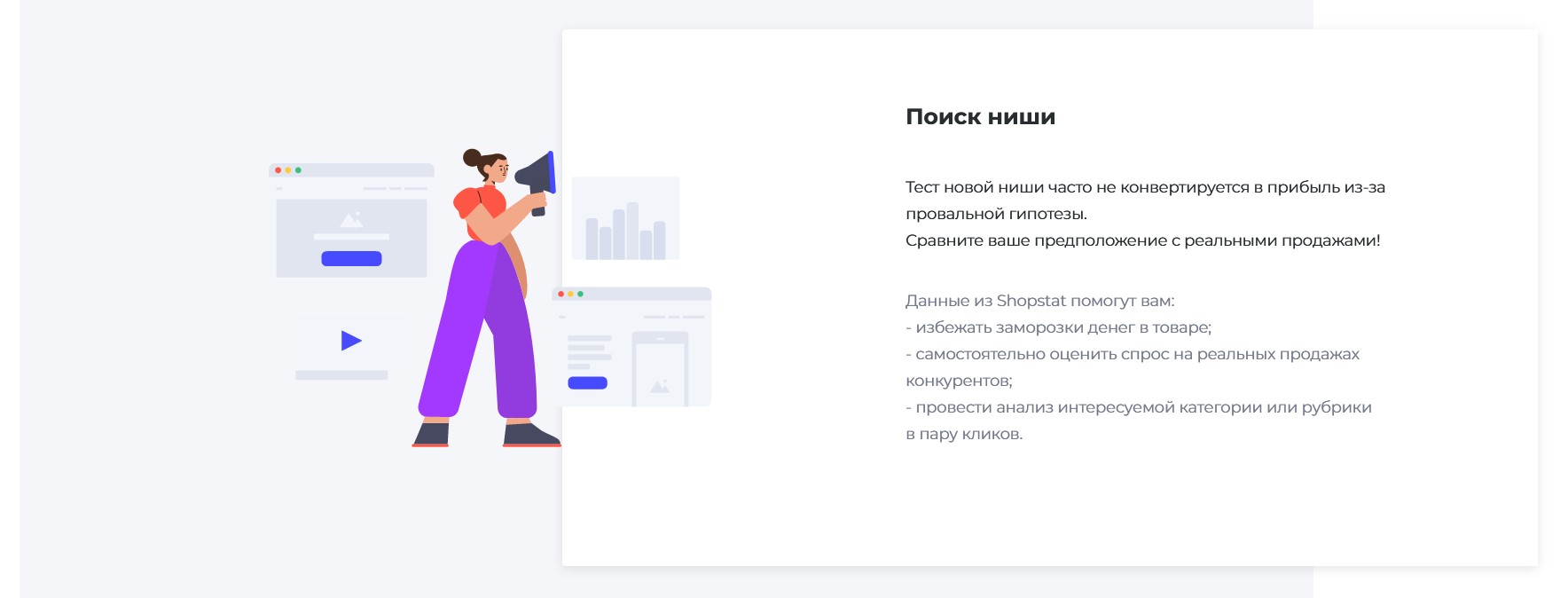Shopstat предоставляет услуги аналитики для маркетплейсов Ozon и WildBerries. Данные для анализа обновляются раз в минуту. С помощью сервиса можно проанализировать все нужные опции: продажи, остатки, цены, категории, конкурентов. С помощью сервиса можно протестировать нишу перед выводом нового товара или заменить товар, который плохо продается на более трендовый.